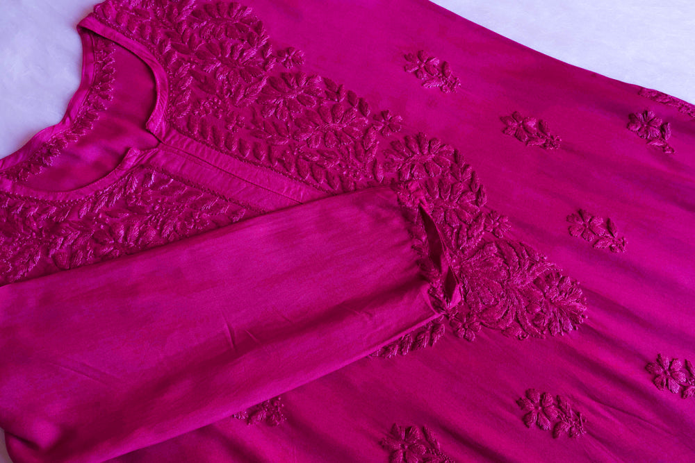 Deep Pink Ombre Long Rayon top with chikankari handwork in Paisley and Floral pattern. It's a really Stylish top with beautiful details and comfort!
