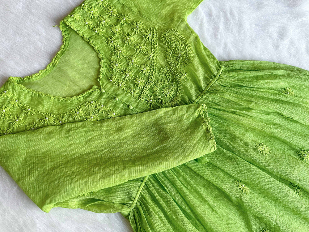 Lime Green short Kota top with handwork in Paisley and Floral pattern with delicate Pleats with Dori's to fasten and gives a peplum like look. The pearl details gives it a very delicate look.
