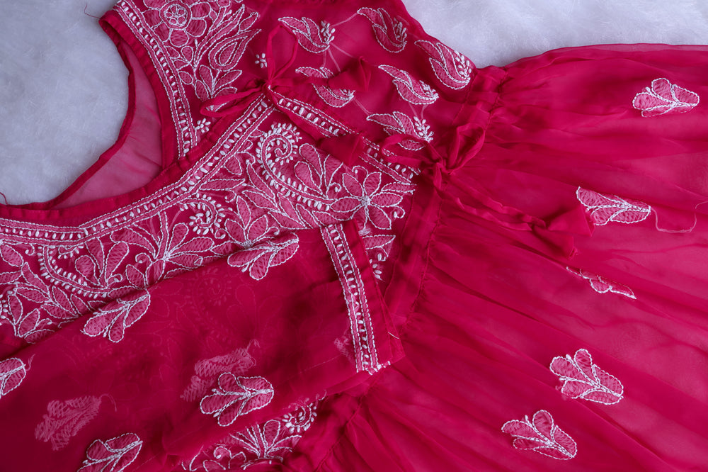 Deep Pink short Georgette top with chikankari handwork in Paisley and Floral design with Angarakha pattern, delicate Pleats with Dori's to fasten and gives a peplum like look.
