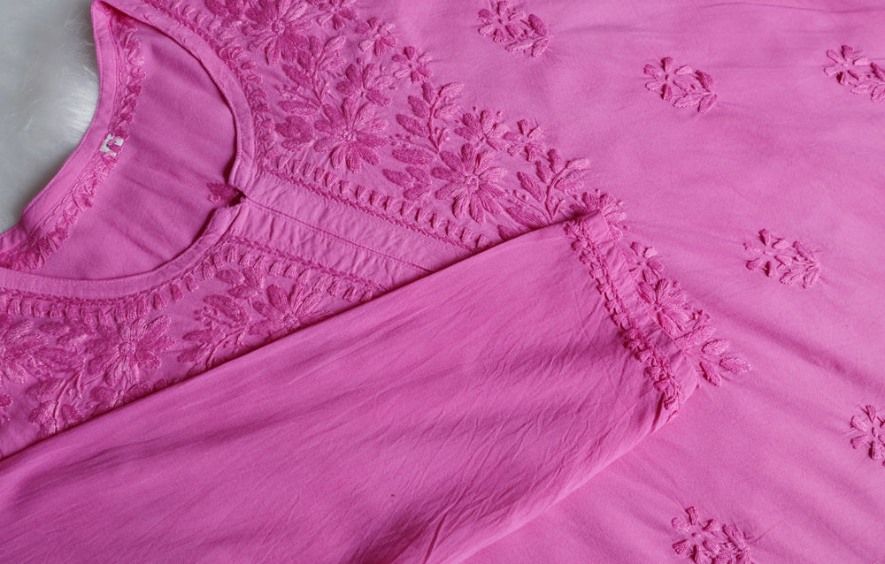 Baby Pink Ombre short Rayon top with chikankari handwork in Paisley and Floral pattern. It's a really Stylish top with beautiful details and comfort!