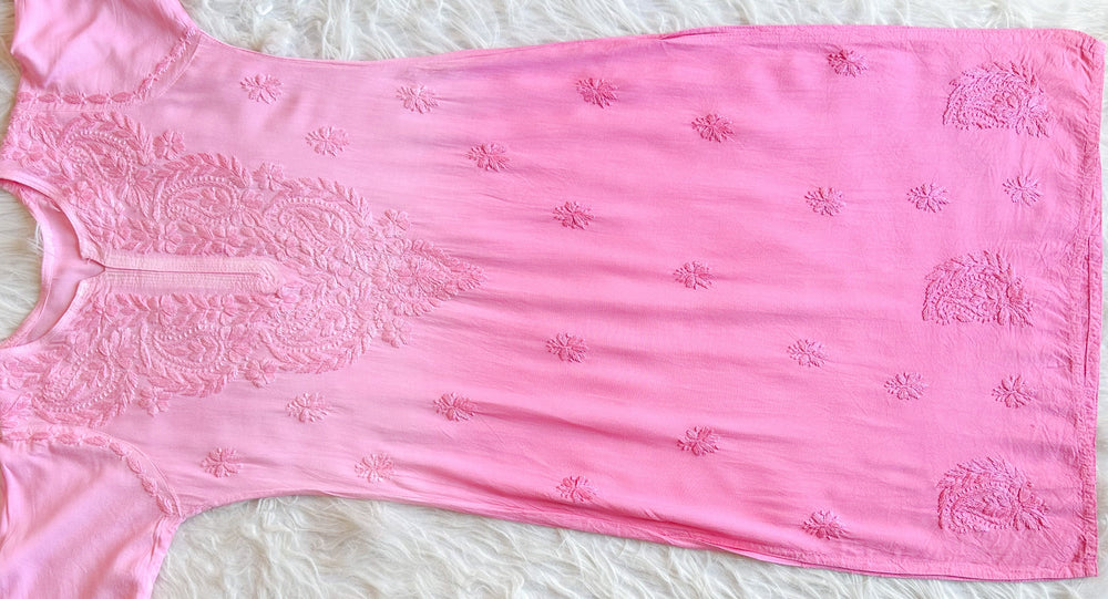 Pink Ombre Long Rayon top with chikankari handwork in Paisley and Floral pattern. It's a really Stylish top with beautiful details and comfort!