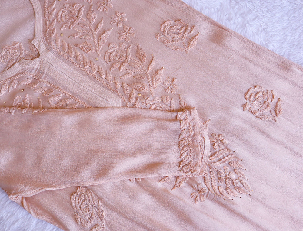 Rose Beige long pure Chiffon kurta with chikankari handwork in Leaf and Floral intricate pattern with Mukaish embellishments on the kurta.