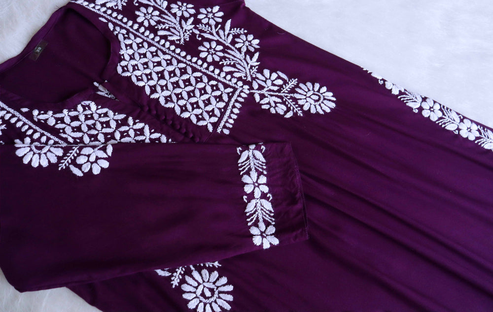 Deep Purple Long Rayon top with chikankari handwork in Paisley and Floral pattern and Potli buttons in the front. It's a really Stylish kurta with beautiful details and comfort!