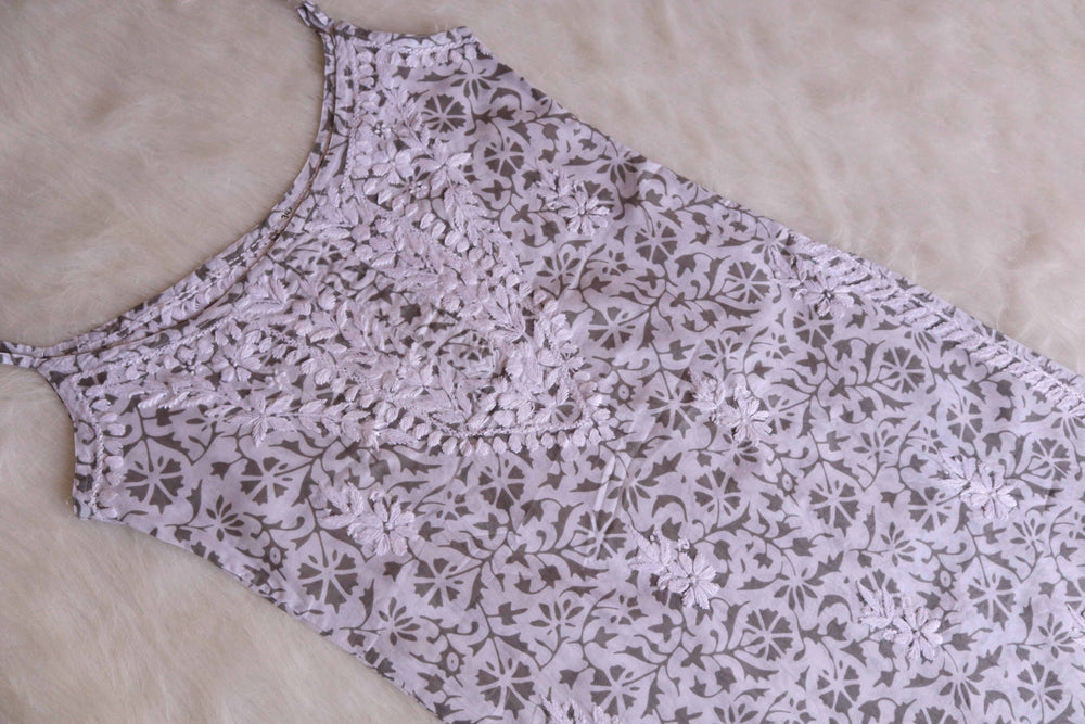 Grey Knee length Mulmul top with chikankari handwork in Paisley and Floral pattern with Strappy sleeves.