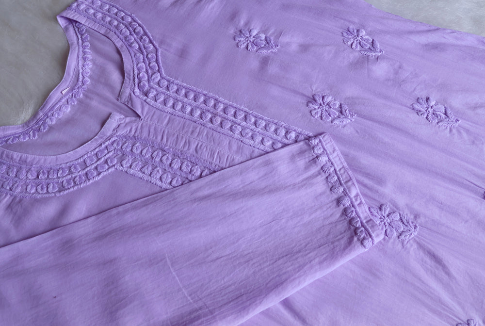 Lavender Pure Cotton kurta with chikankari handwork in Paisley and Floral pattern.