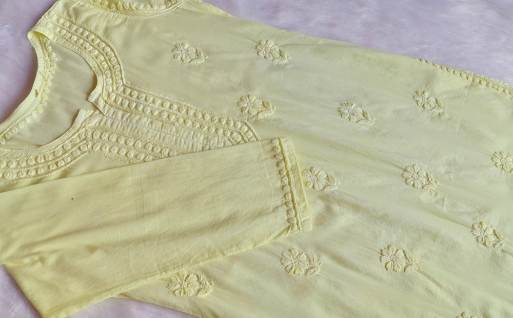 Pastel Yellow Pure Cotton kurta with chikankari handwork in Paisley and Floral pattern.