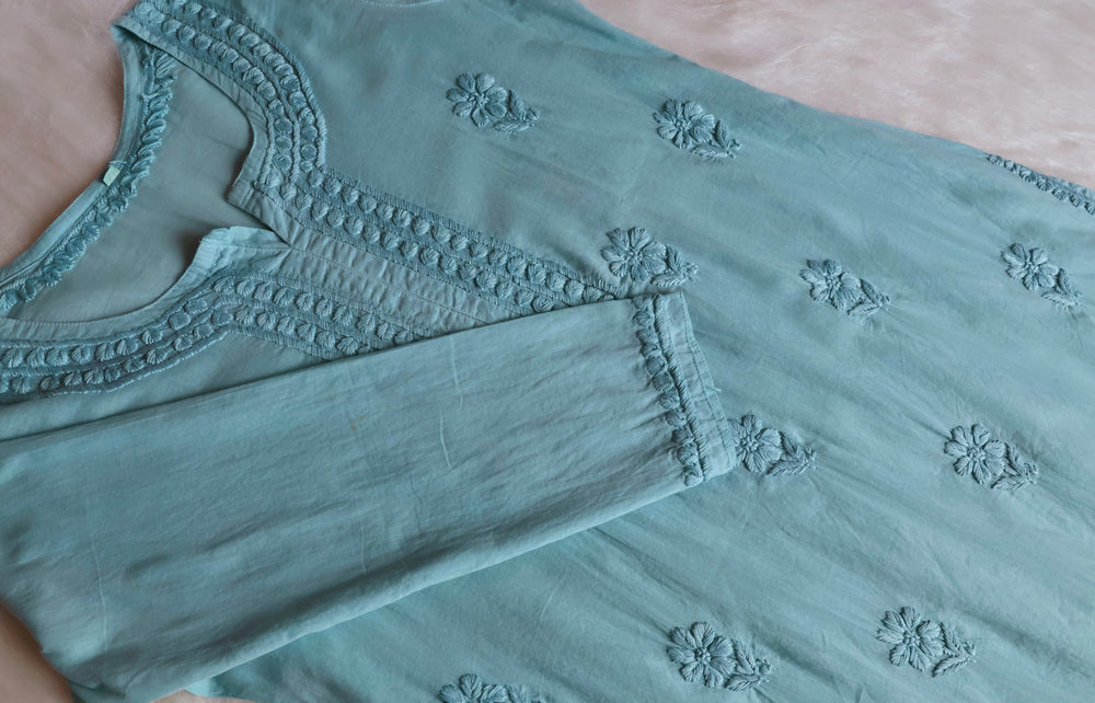 Sea Blue Pure Cotton kurta with chikankari handwork in Paisley and Floral pattern.