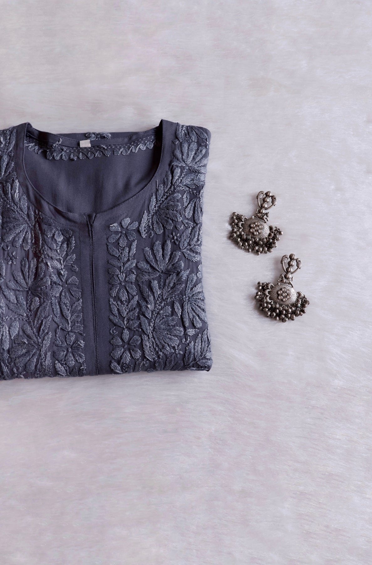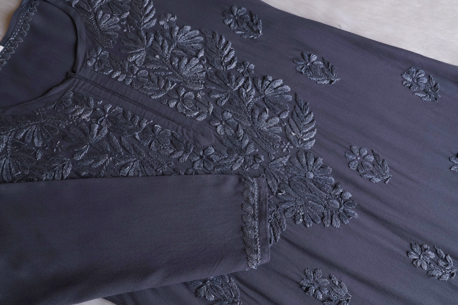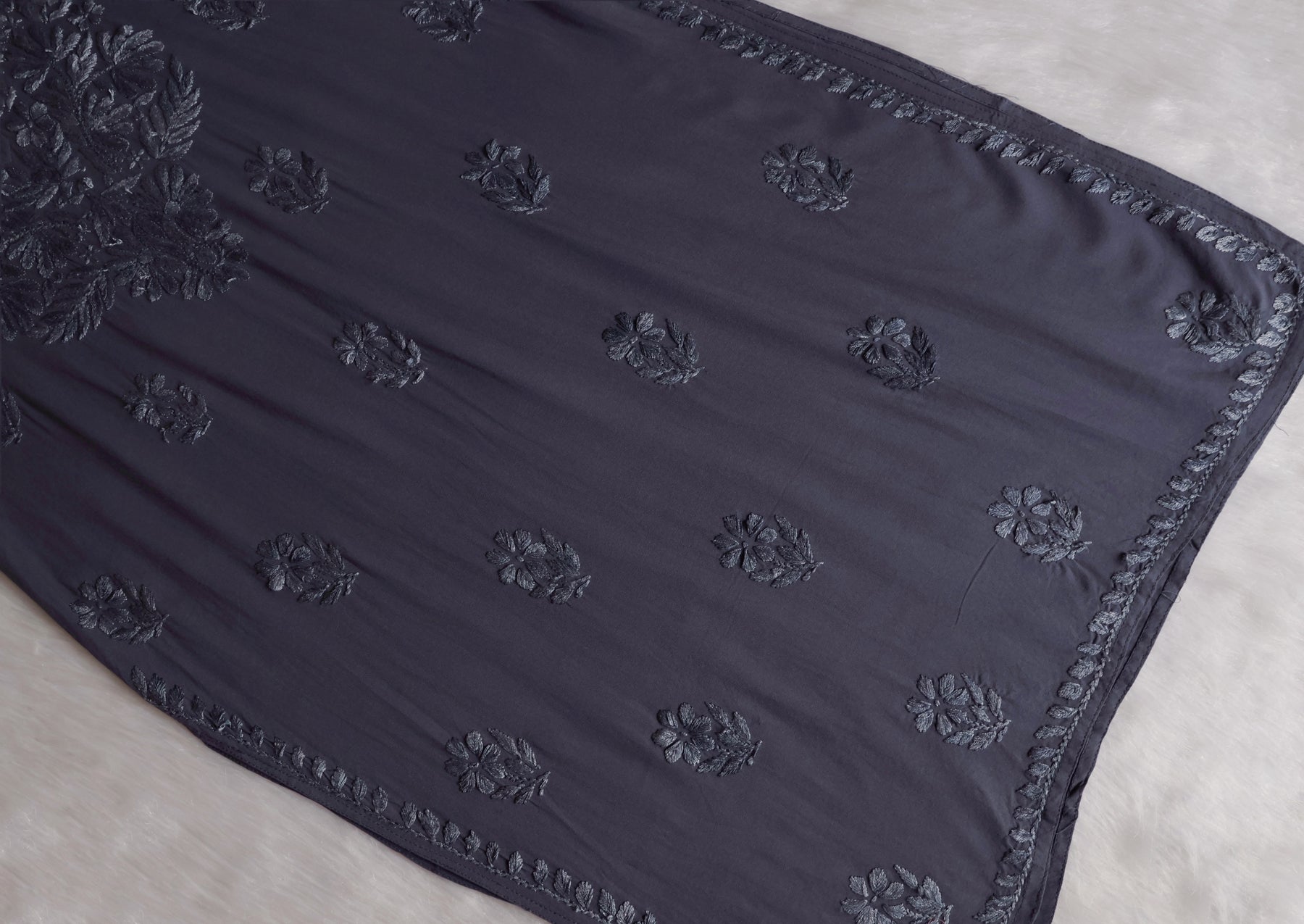 Grey Ombre Long Rayon top with chikankari handwork in Paisley and Floral pattern. It's a really Stylish top with beautiful details and comfort!