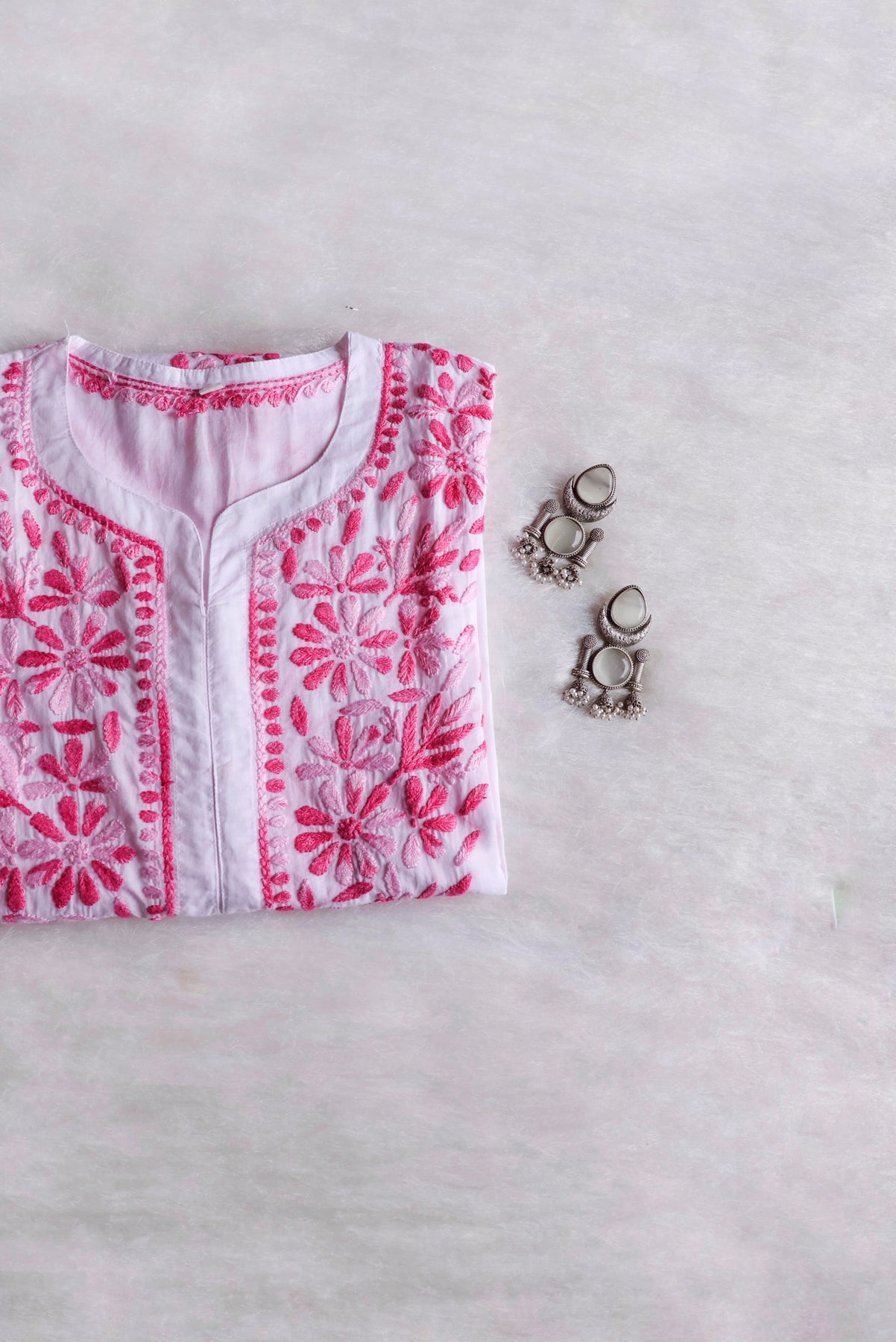 Gul Kashmiri White & Pink Pure Cotton Kurta