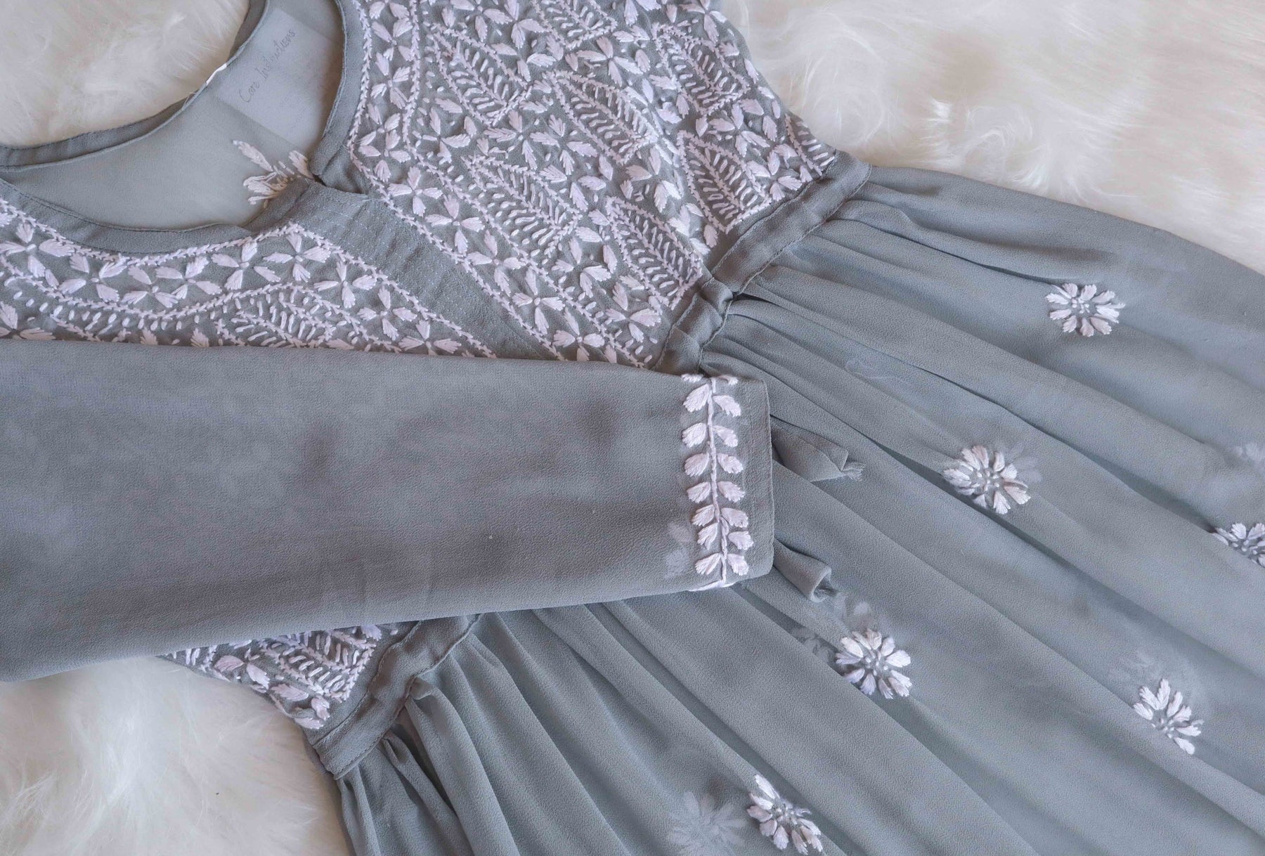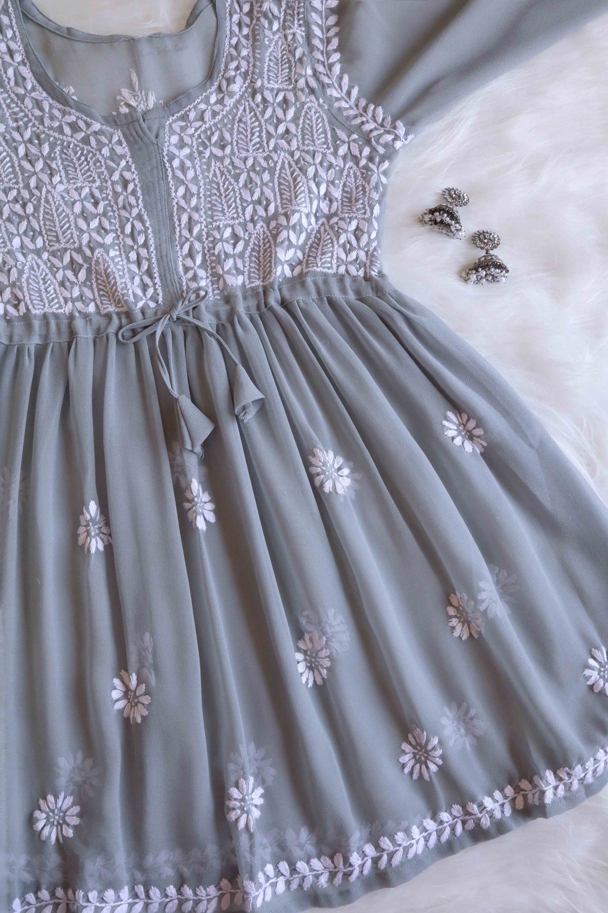Grey short Georgette frock with chikankari handwork in Paisley and Floral pattern with delicate pleats details and dori to fasten and give a peplum look.