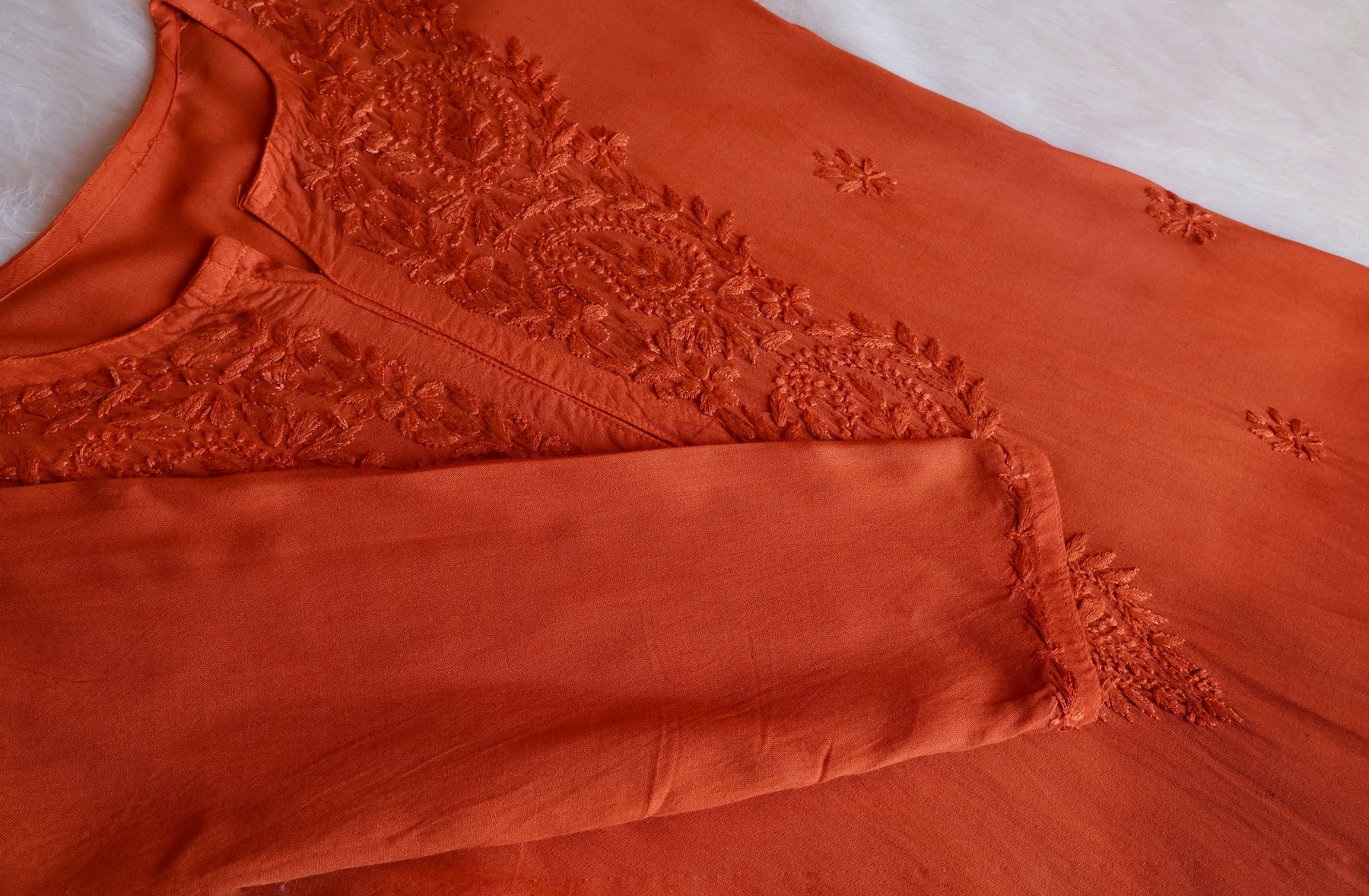 Rust Long Rayon kurta with self colored chikankari in Floral & Jaal pattern paired with a matching pure chiffon dupatta and matching pants with pockets to complete the look.