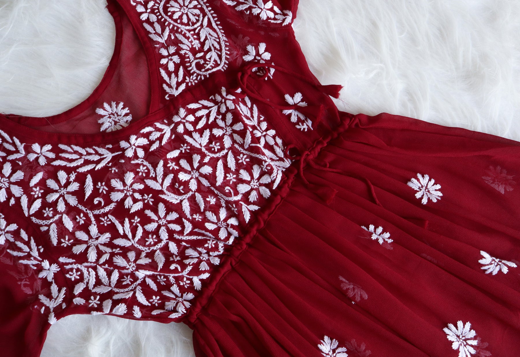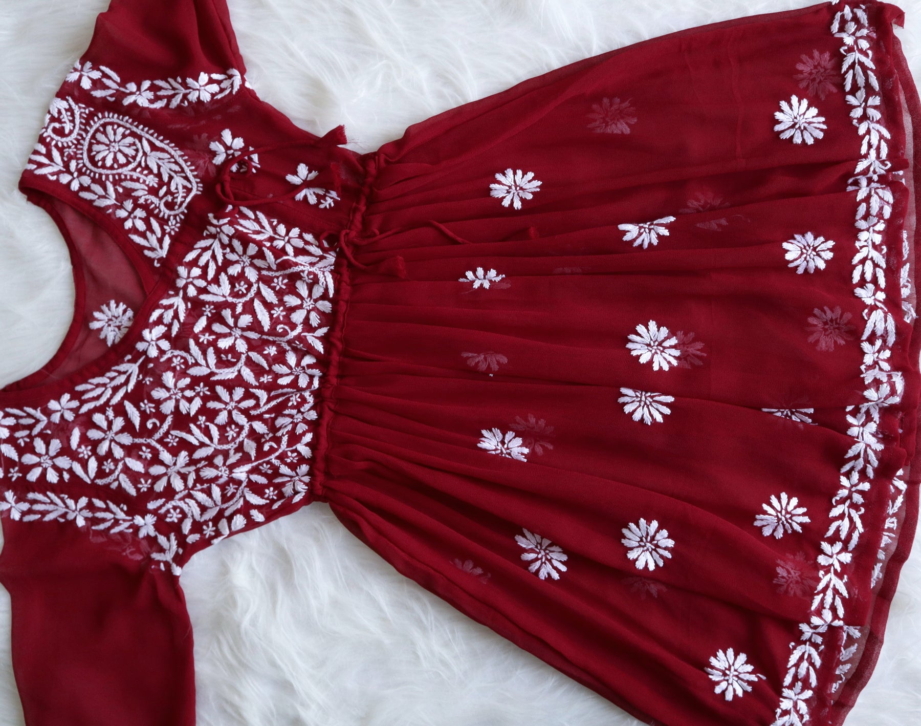 Maroon & White short Georgette top with chikankari handwork in Paisley and Floral design with Angarakha pattern, delicate Pleats with Dori's to fasten and gives a peplum like look.