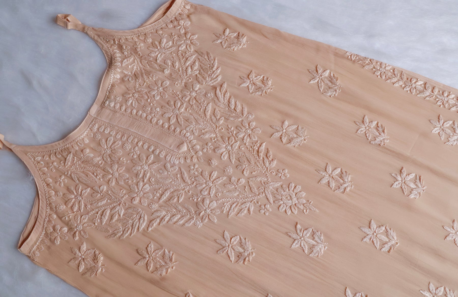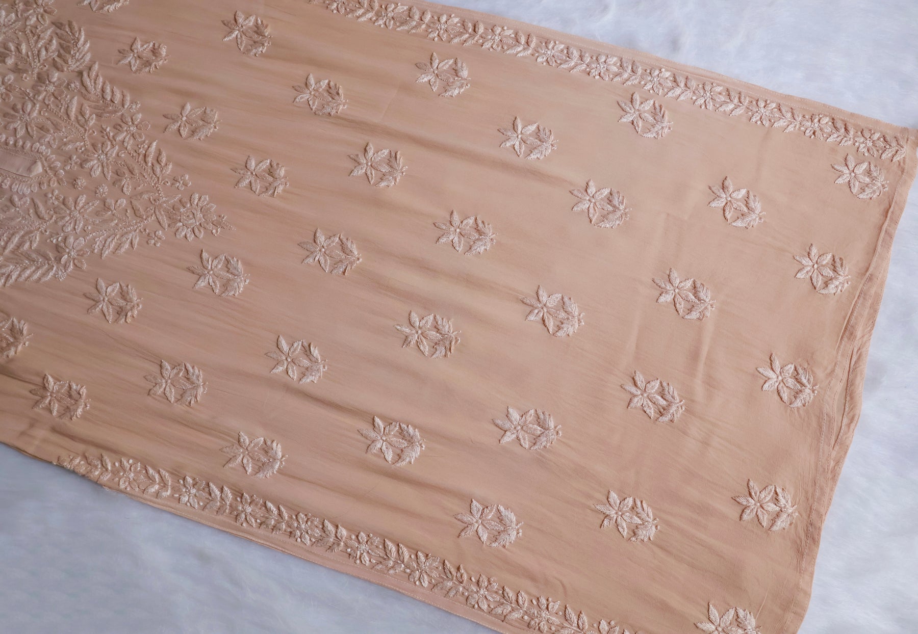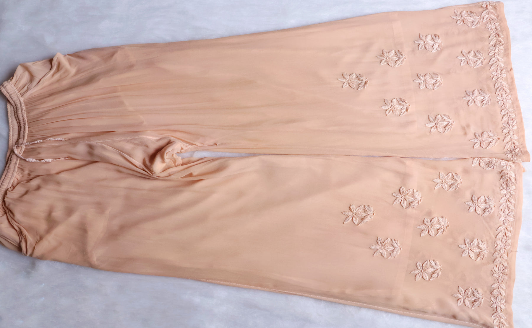 Beige Long Viscose kurta with self colored chikankari in Floral & Jaal pattern paired with a matching palazzo with pockets and astar to complete the look.