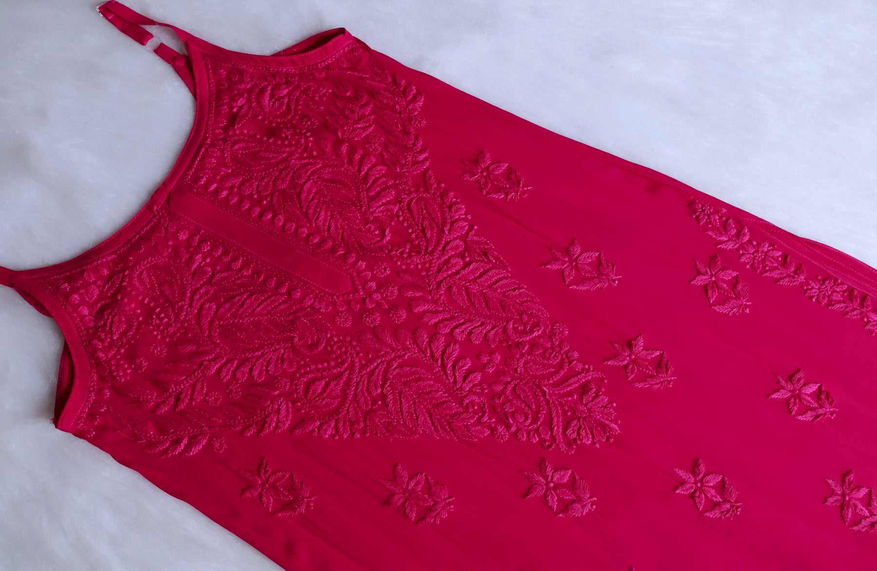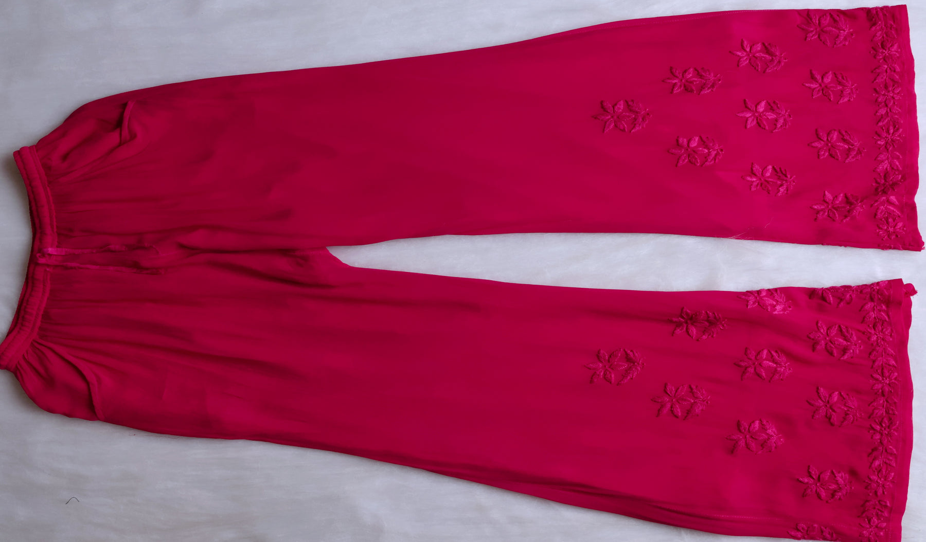 Deep Pink Long Viscose kurta with self colored chikankari in Floral & Jaal pattern paired with a matching palazzo with pockets and astar to complete the look.