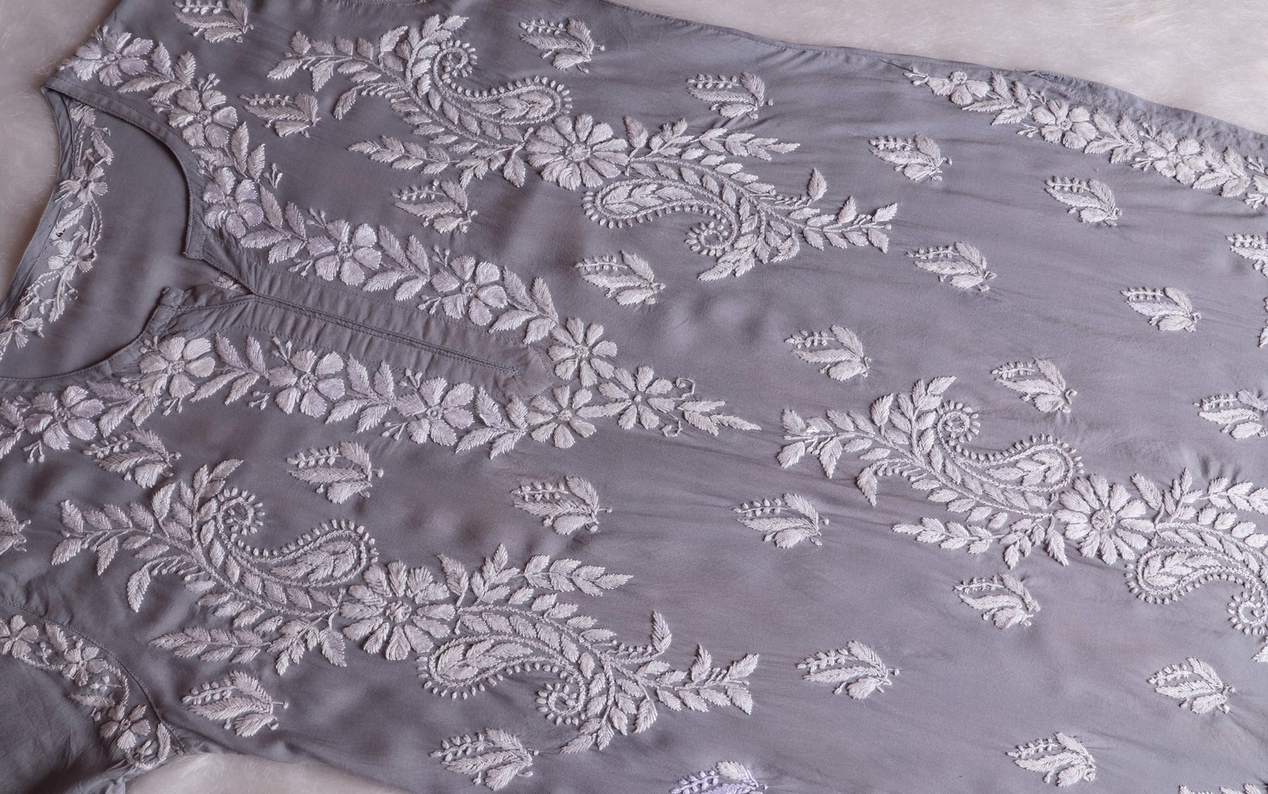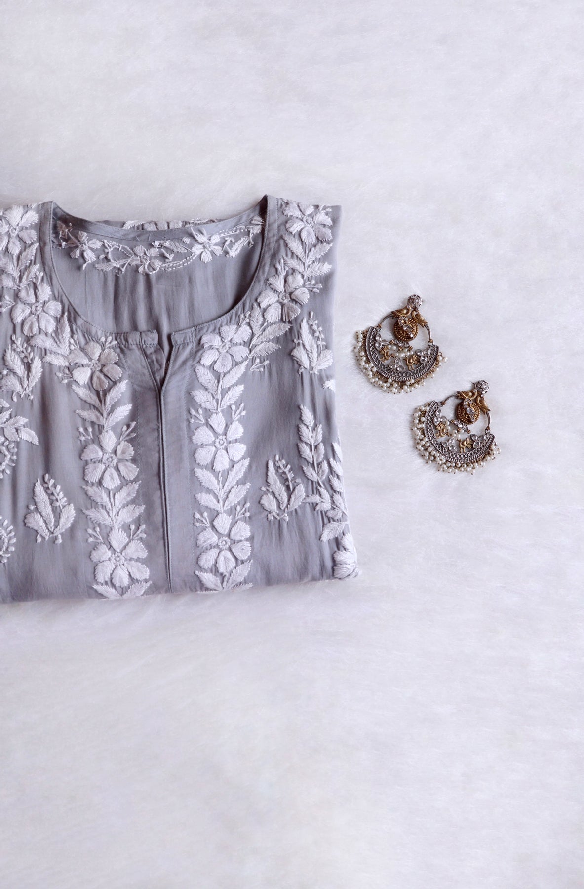 Grey Modal long kurta with chikankari handwork in Paisley and Rose Floral pattern in the front to elevate the look.