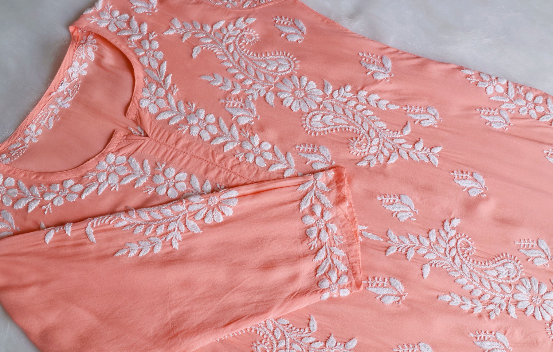 Peach Modal long kurta with chikankari handwork in Paisley and Rose Floral pattern in the front to elevate the look.