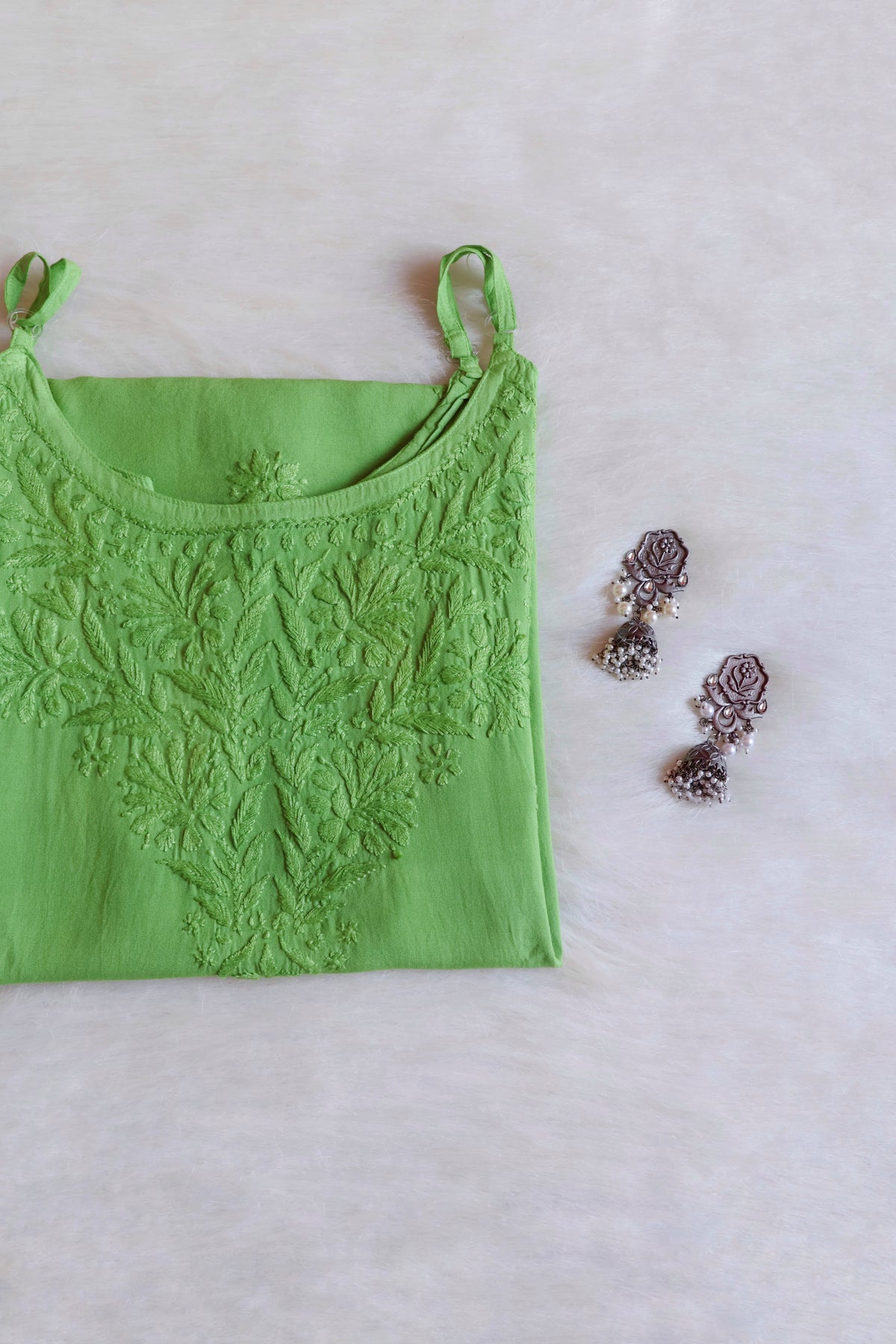 Green long Soft Rayon kurta with chikankari handwork in Leaf and Floral intricate pattern with Strappy shoulders.