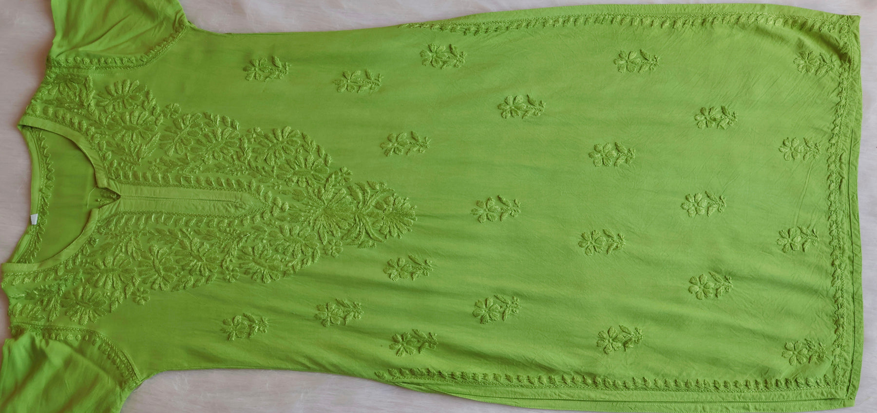 Lime Green Long Rayon kurta with chikankari handwork in Paisley pattern with Intricate details. You need a Soft Rayon kurta in all the seasons. They're the most versatile piece of clothing you can own.