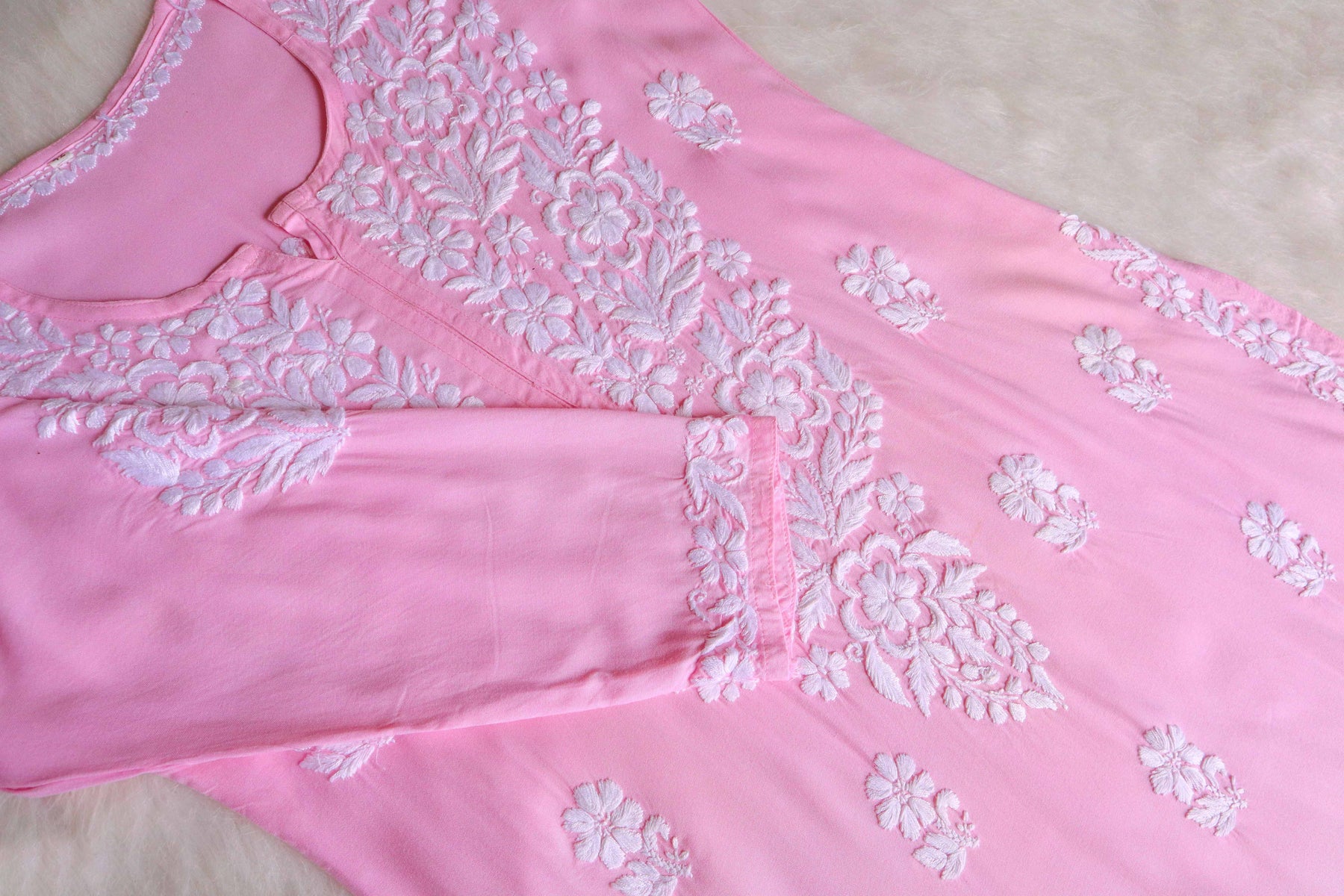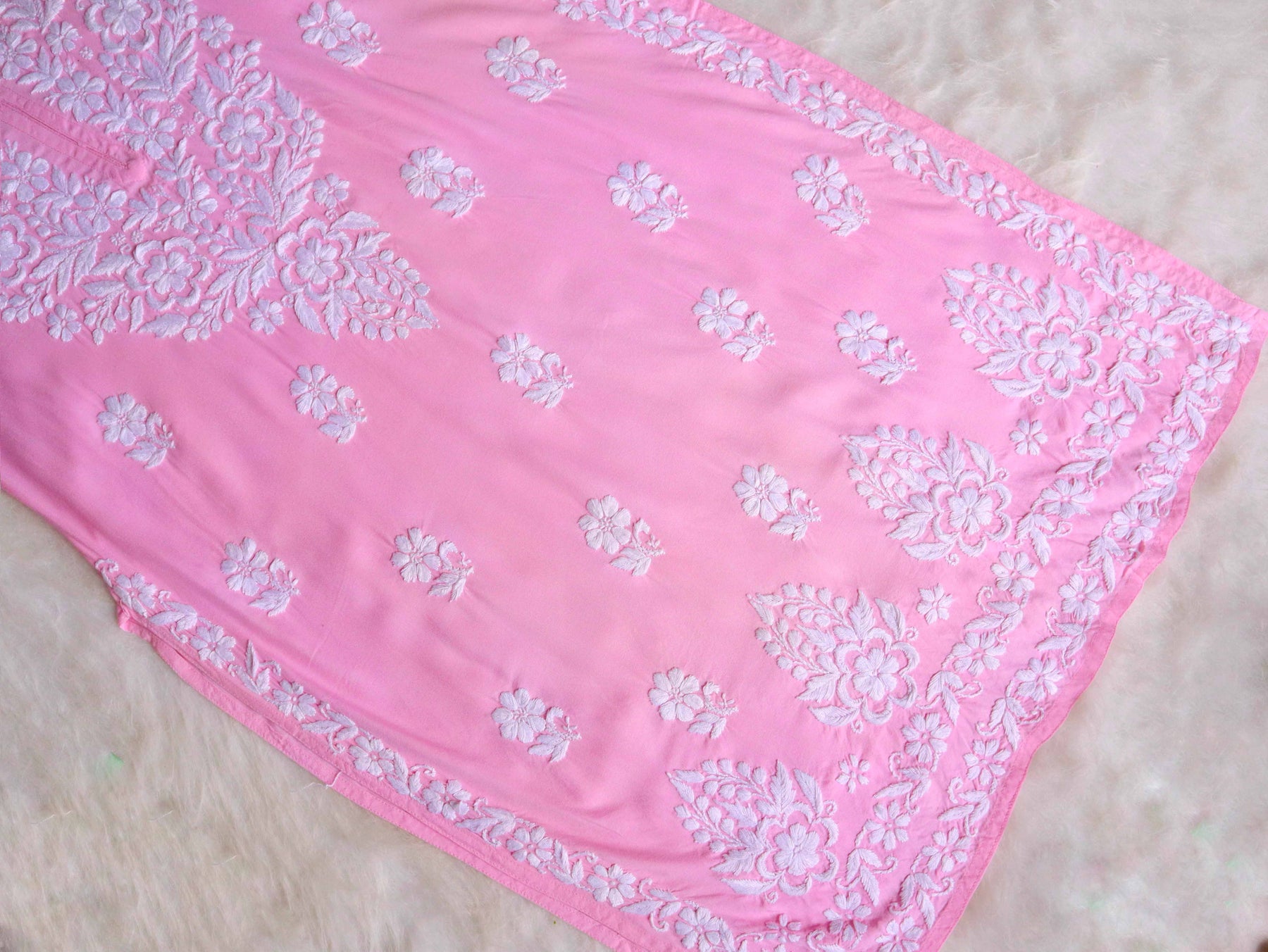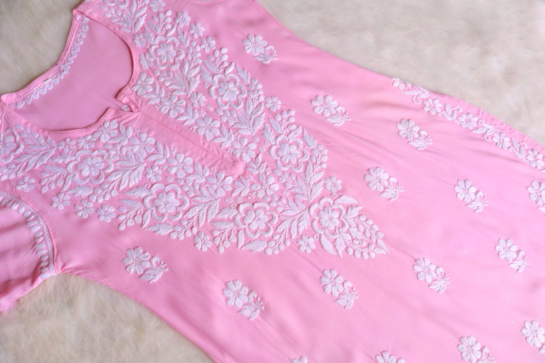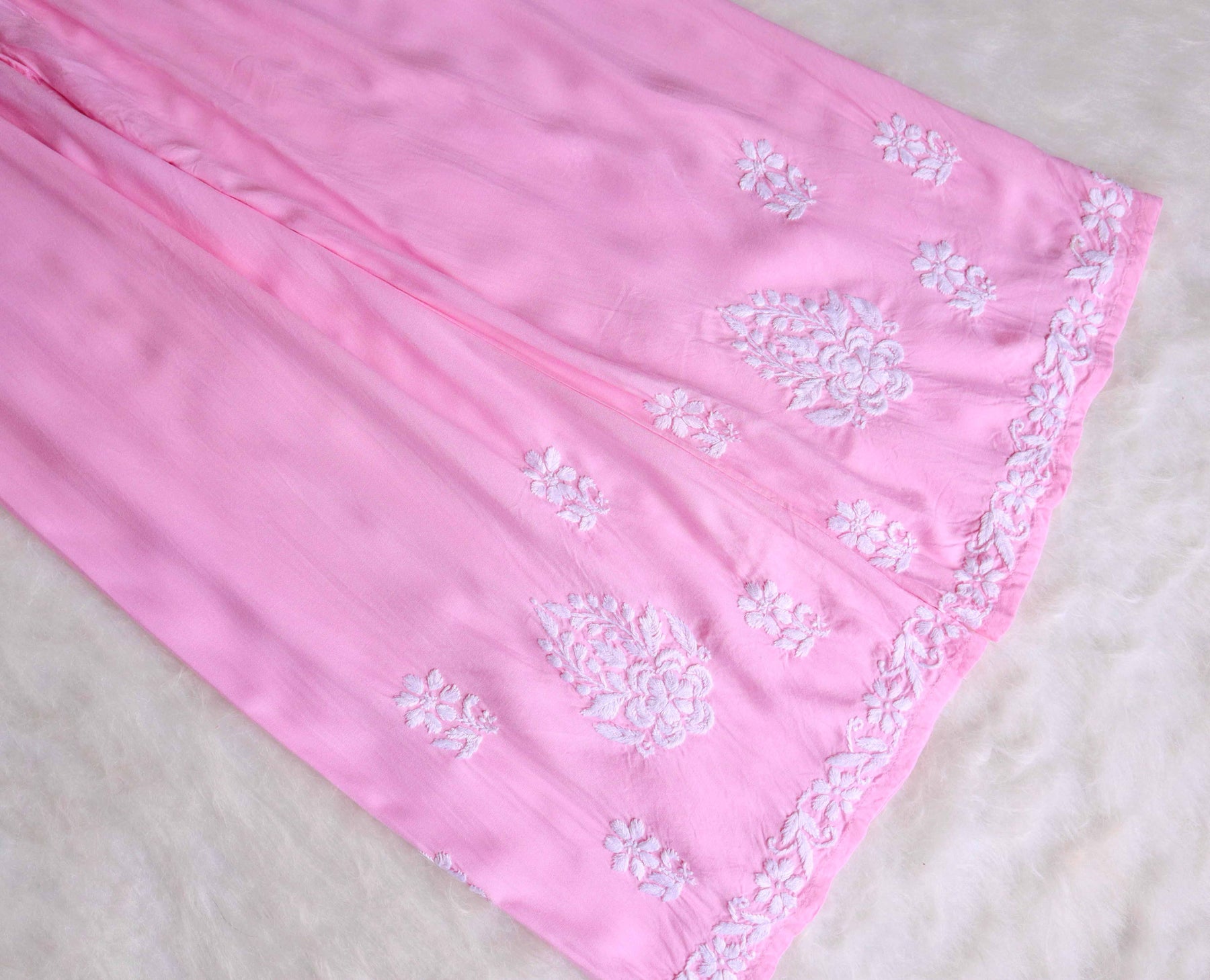 Baby Pink Long rayon kurta with White chikankari in Floral pattern paired with a matching palazzo to complete the look.