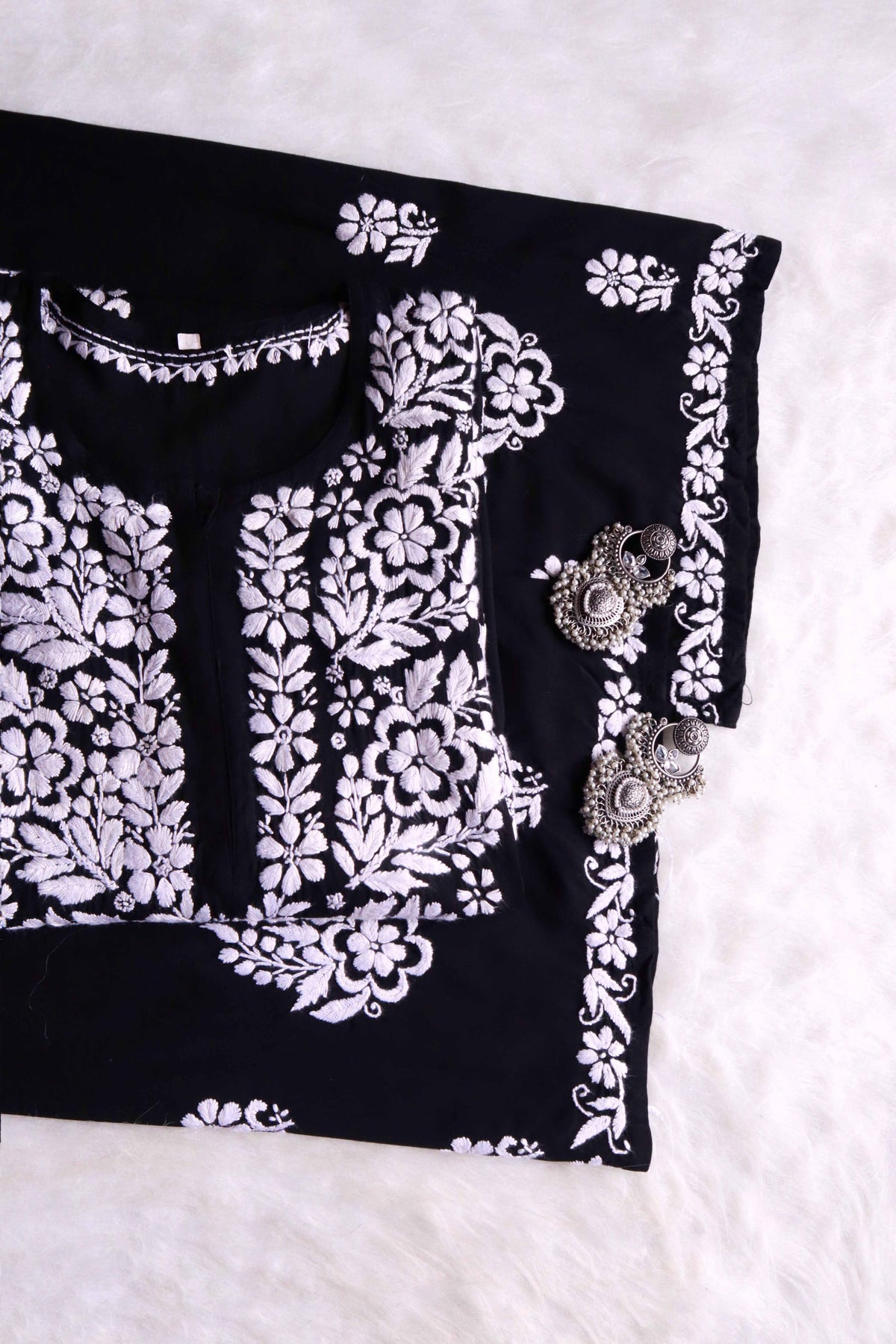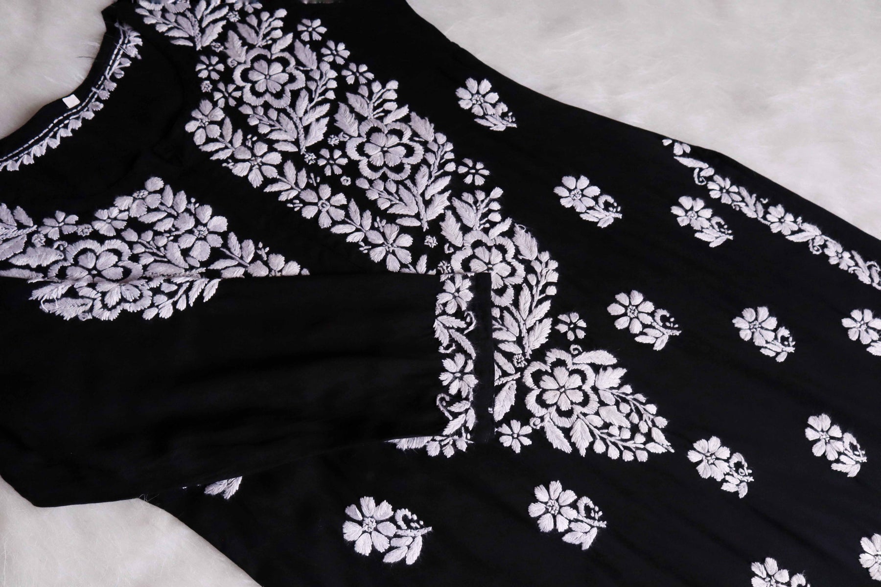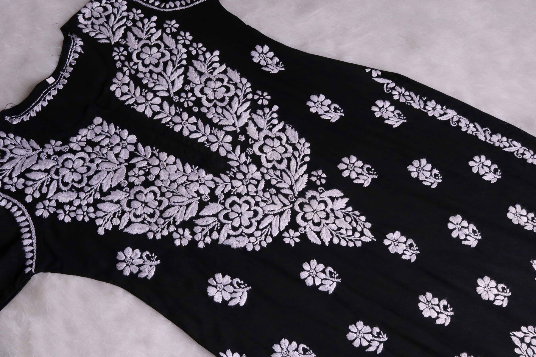 Black Long rayon kurta with White chikankari in Floral pattern paired with a matching palazzo to complete the look.