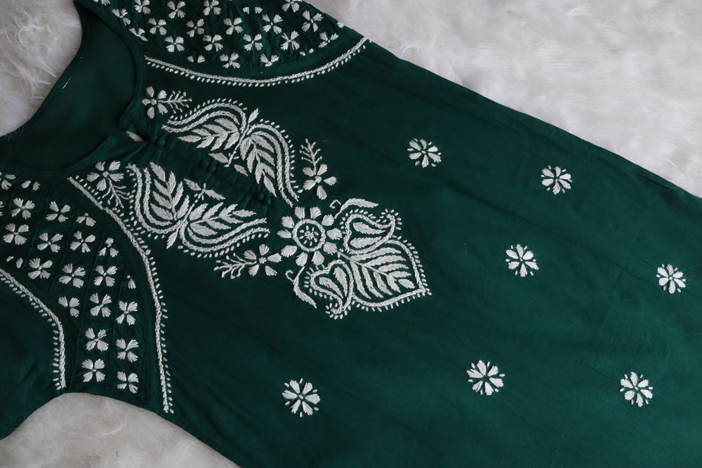 Bottle Green long cotton kurta with self chikankari in Floral & Paisley pattern on beautiful delicate pattern. It's a Stunning and Unique shade to give you a perfect bold vibe!