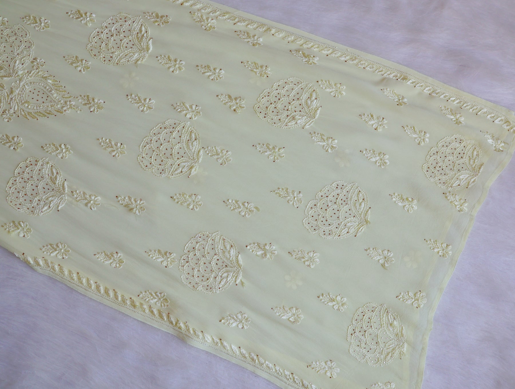 Yellow long pure Viscose Georgette kurta with chikankari handwork in Leaf and Floral intricate pattern with Mukaish embellishments on the kurta.