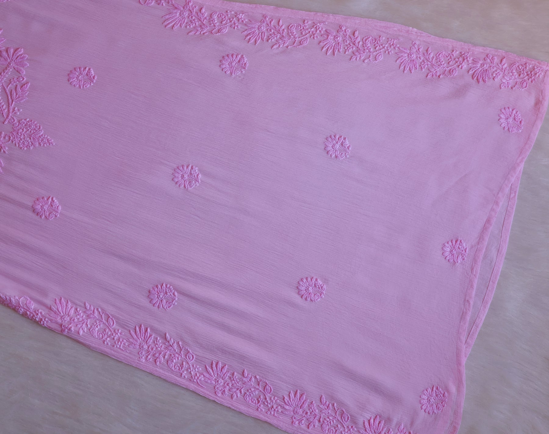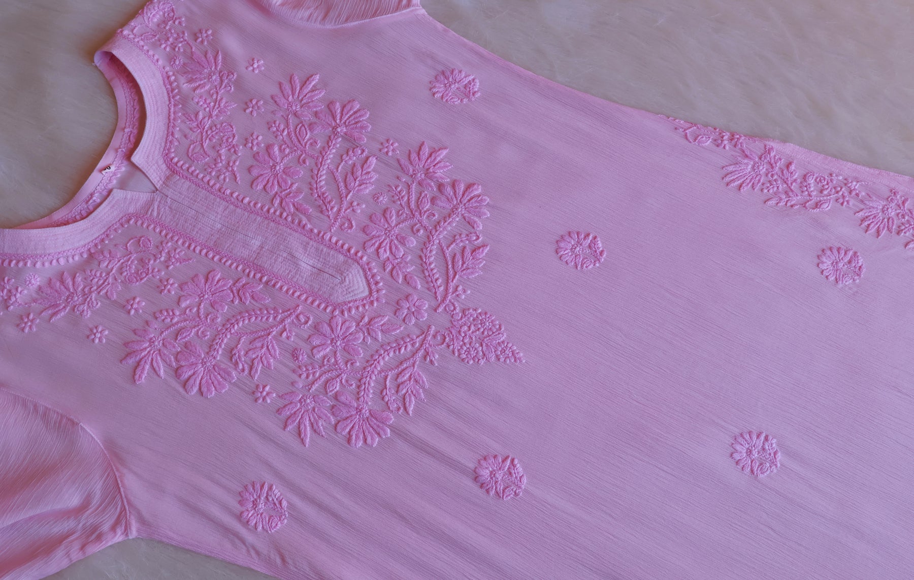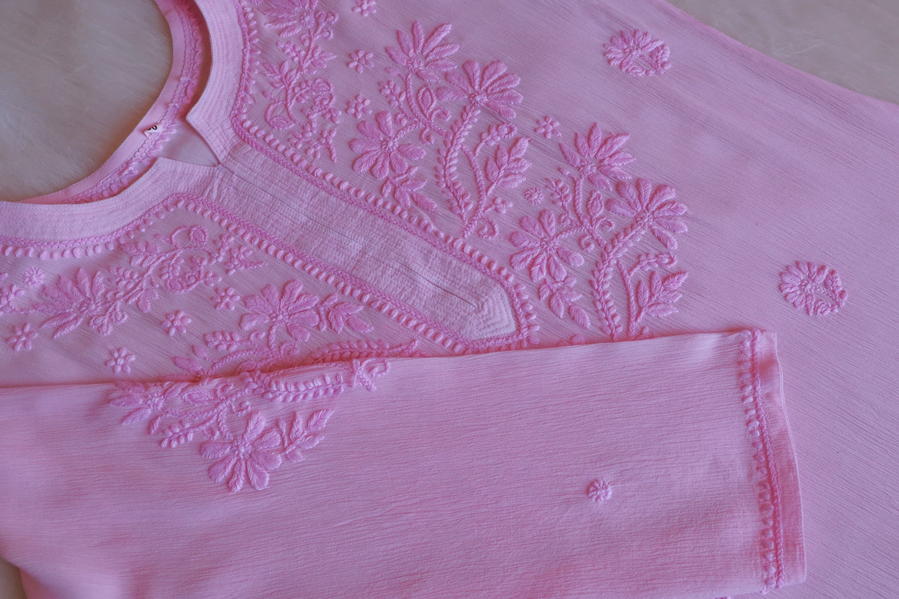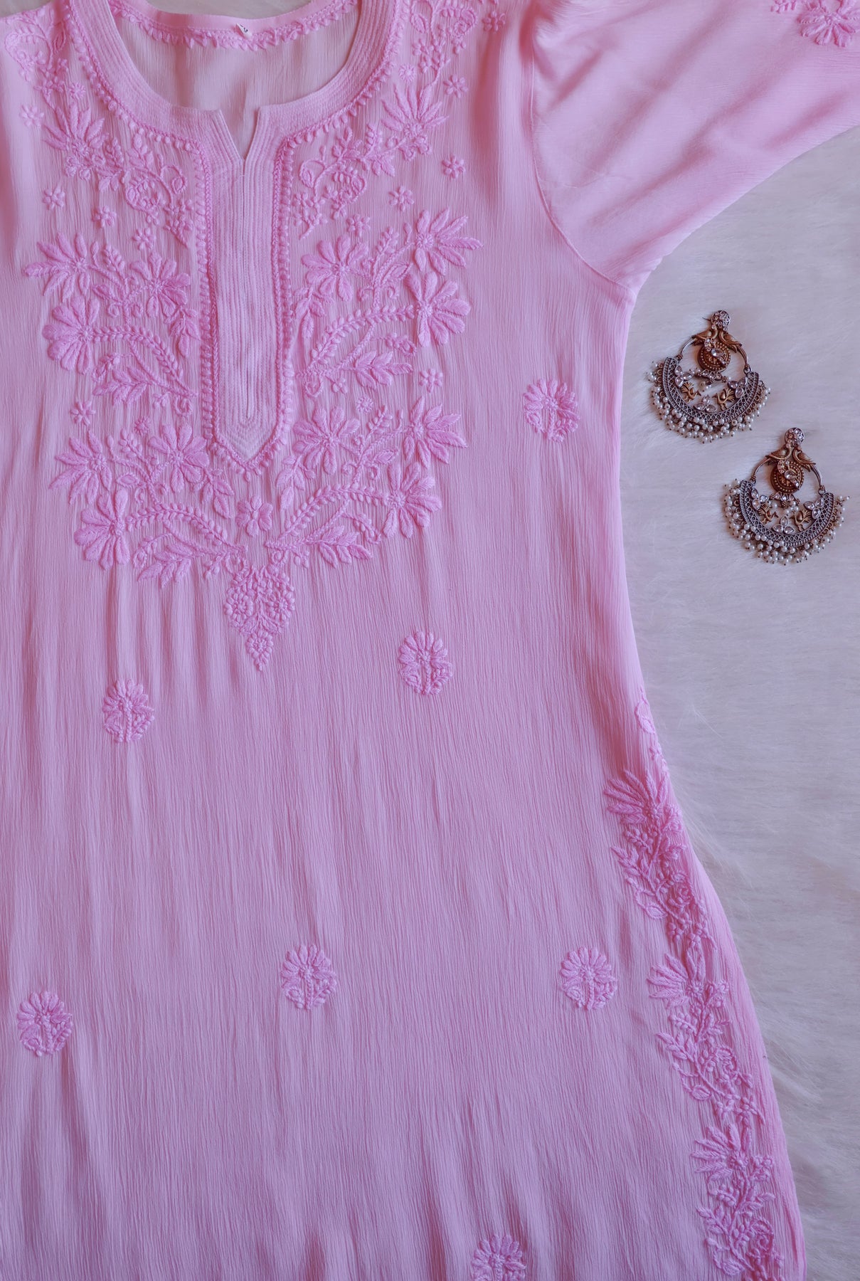 Pastel Pink long pure Chiffon kurta with chikankari handwork in Leaf and Floral intricate pattern on the kurta.
