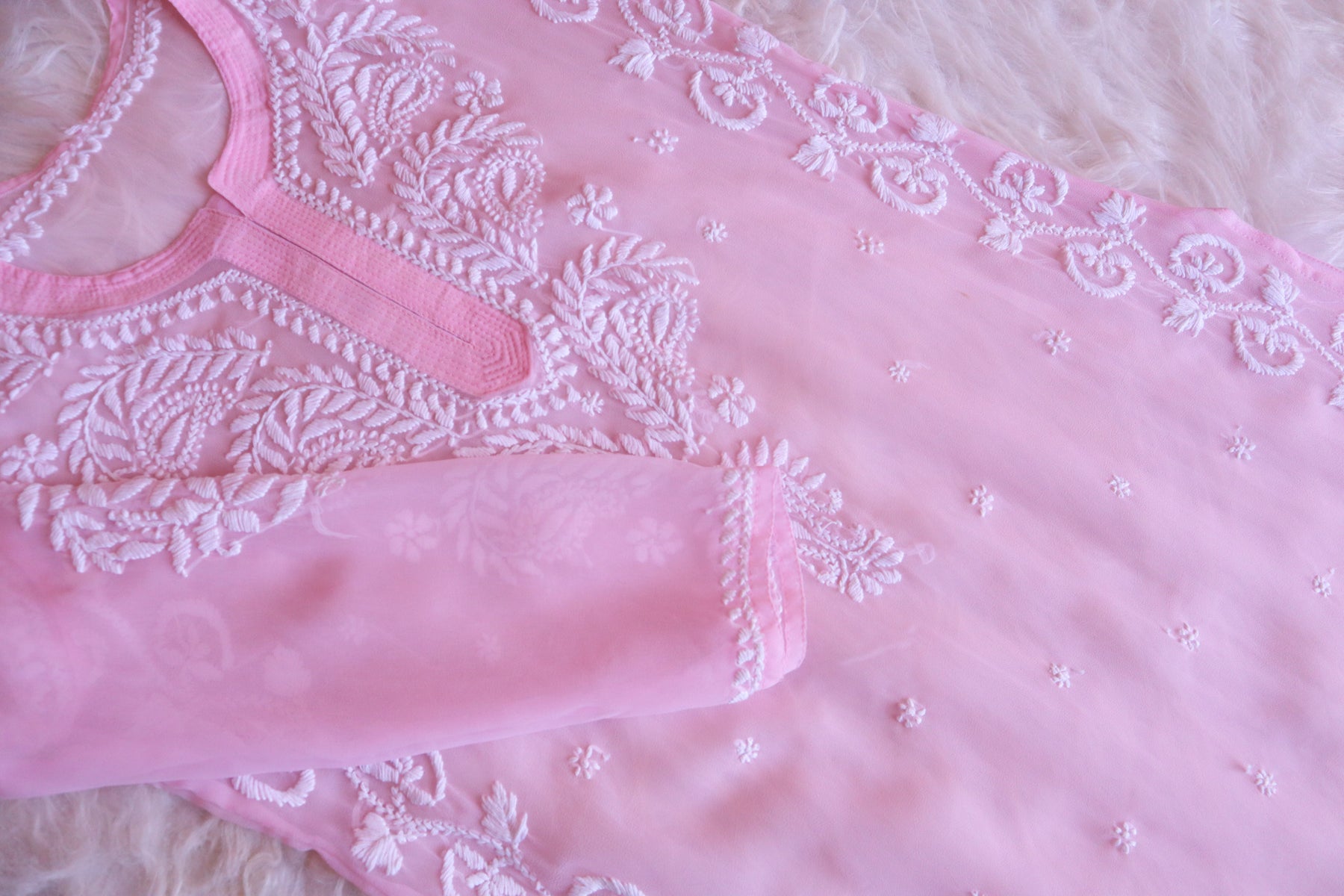Baby Pink long Georgette kurta with White chikankari handwork in Paisley and Floral intricate pattern all over the kurta.
