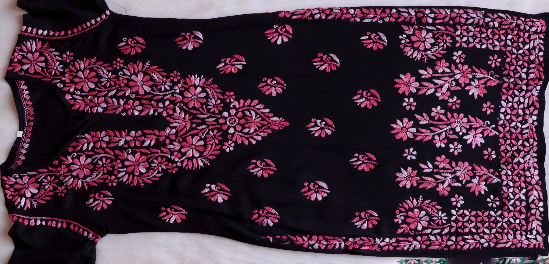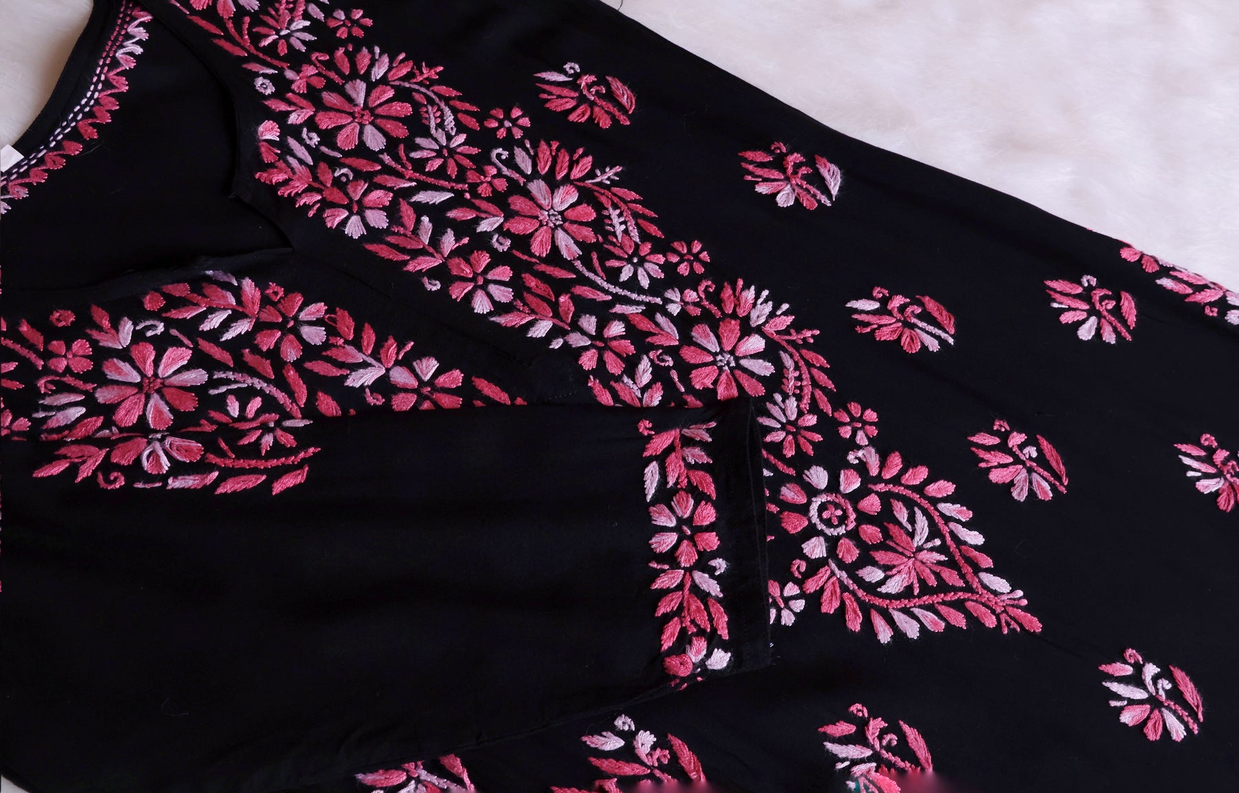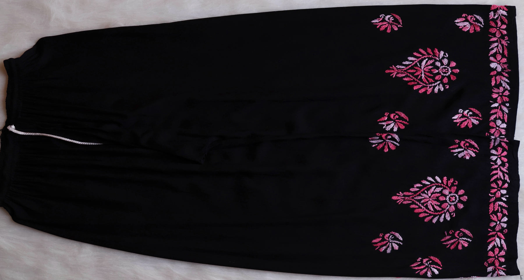 Black Long rayon kurta with Baby Pink chikankari in Floral pattern paired with a matching palazzo to complete the look.