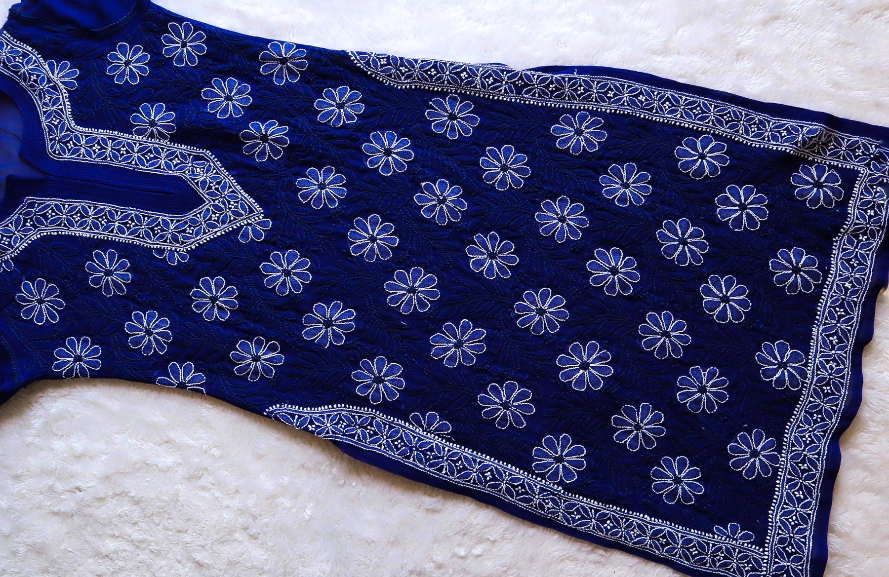 Royal Blue & White Georgette kurta - Noor Chikankari