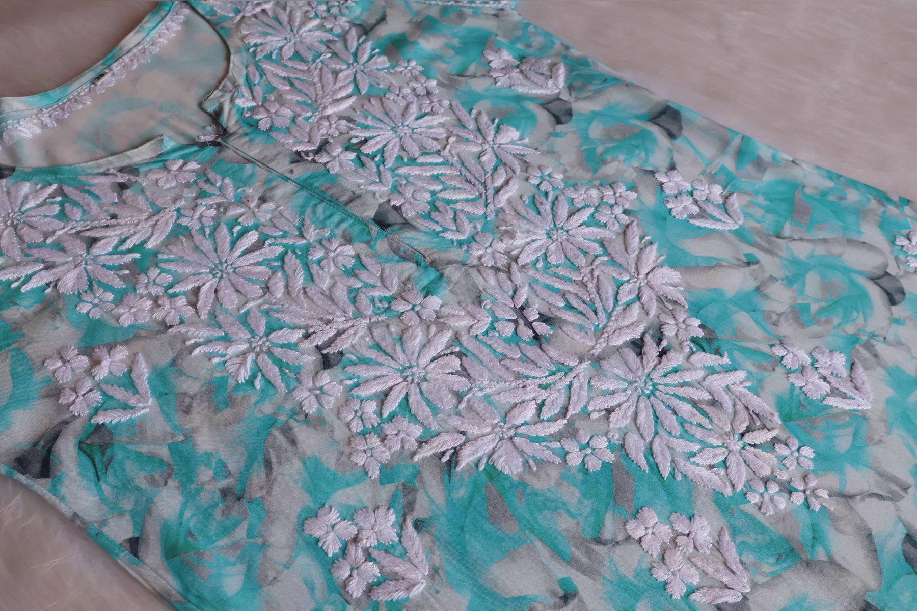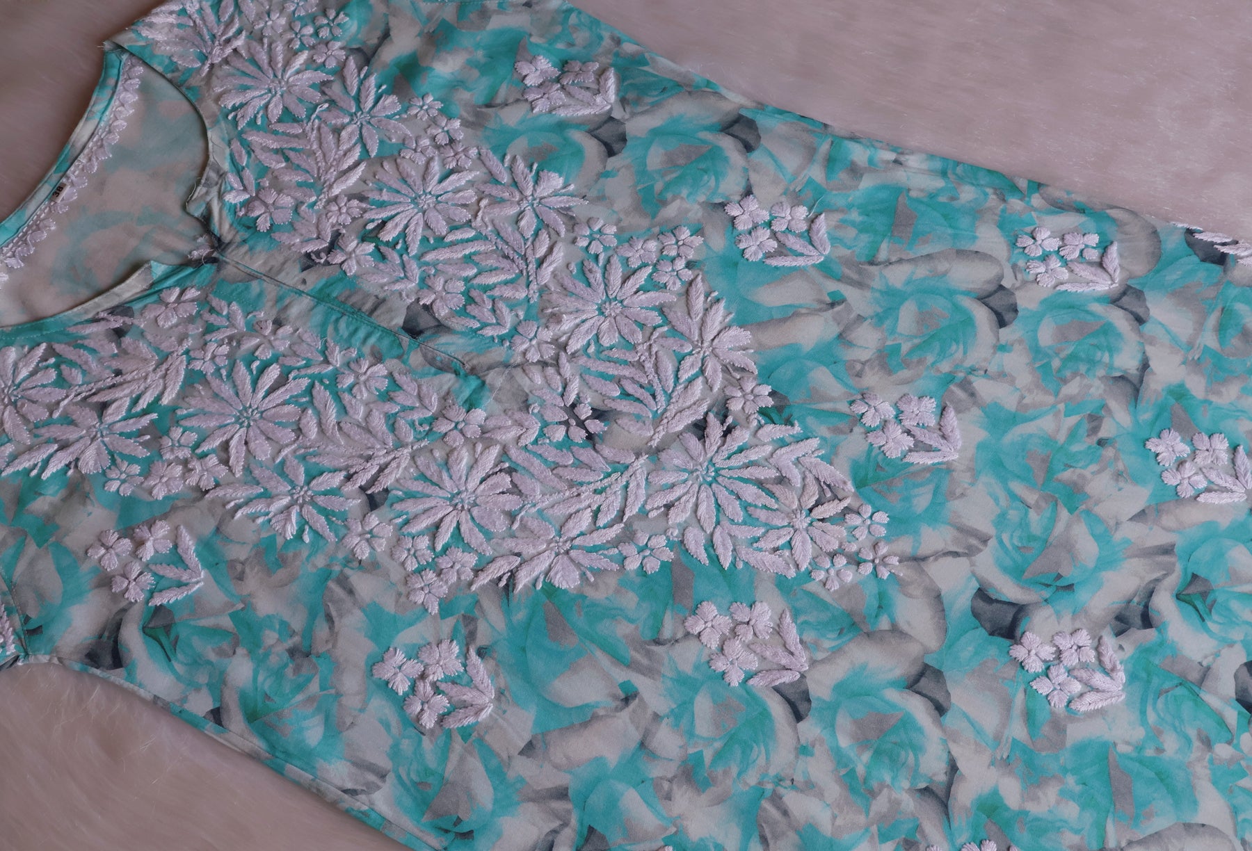 Sea Blue Long Rayon Kurta in Eyecatching print print with chikankari handwork in Paisley pattern with Intricate details. You need a Soft Rayon kurta in all the seasons. They're the most versatile piece of clothing you can own.