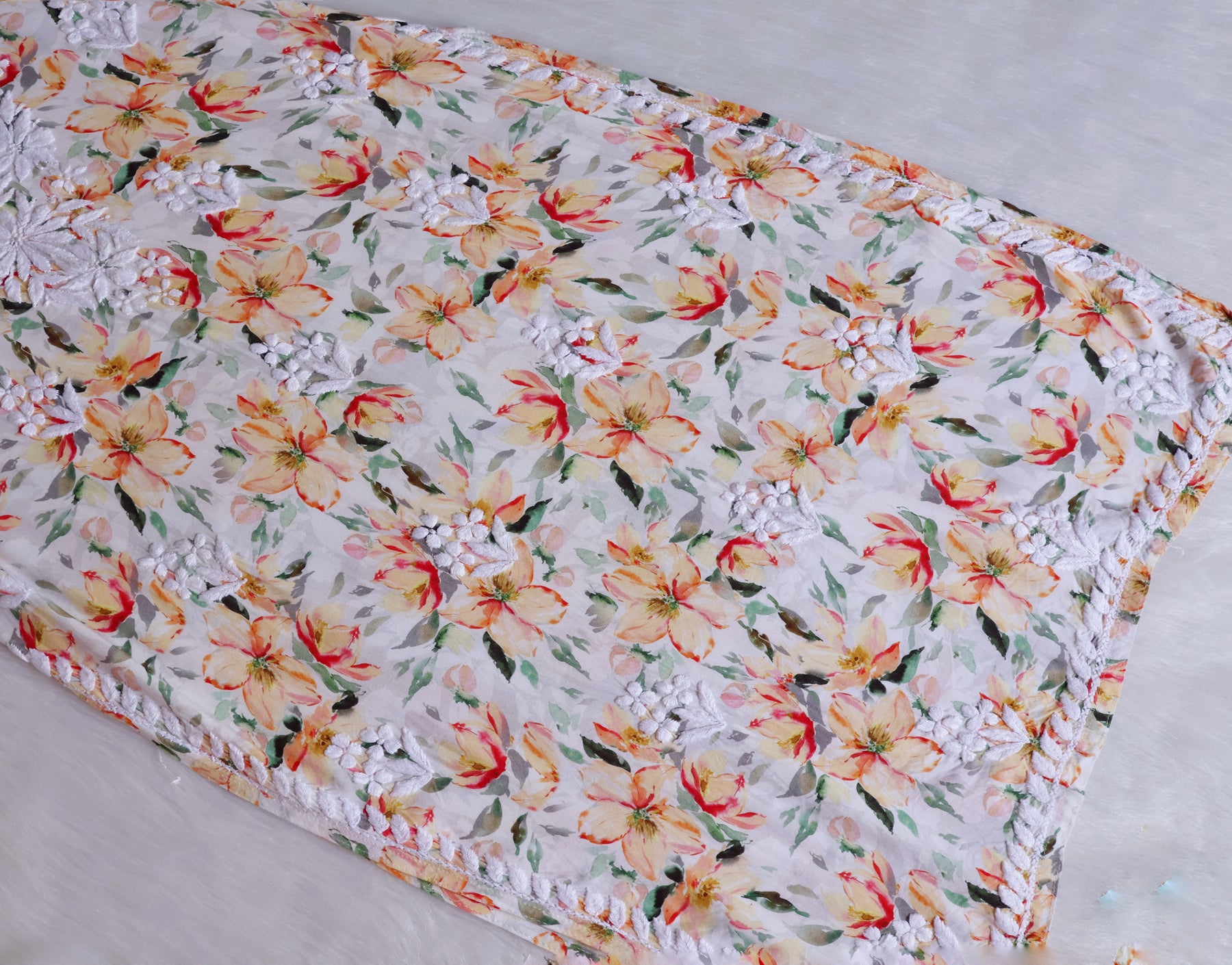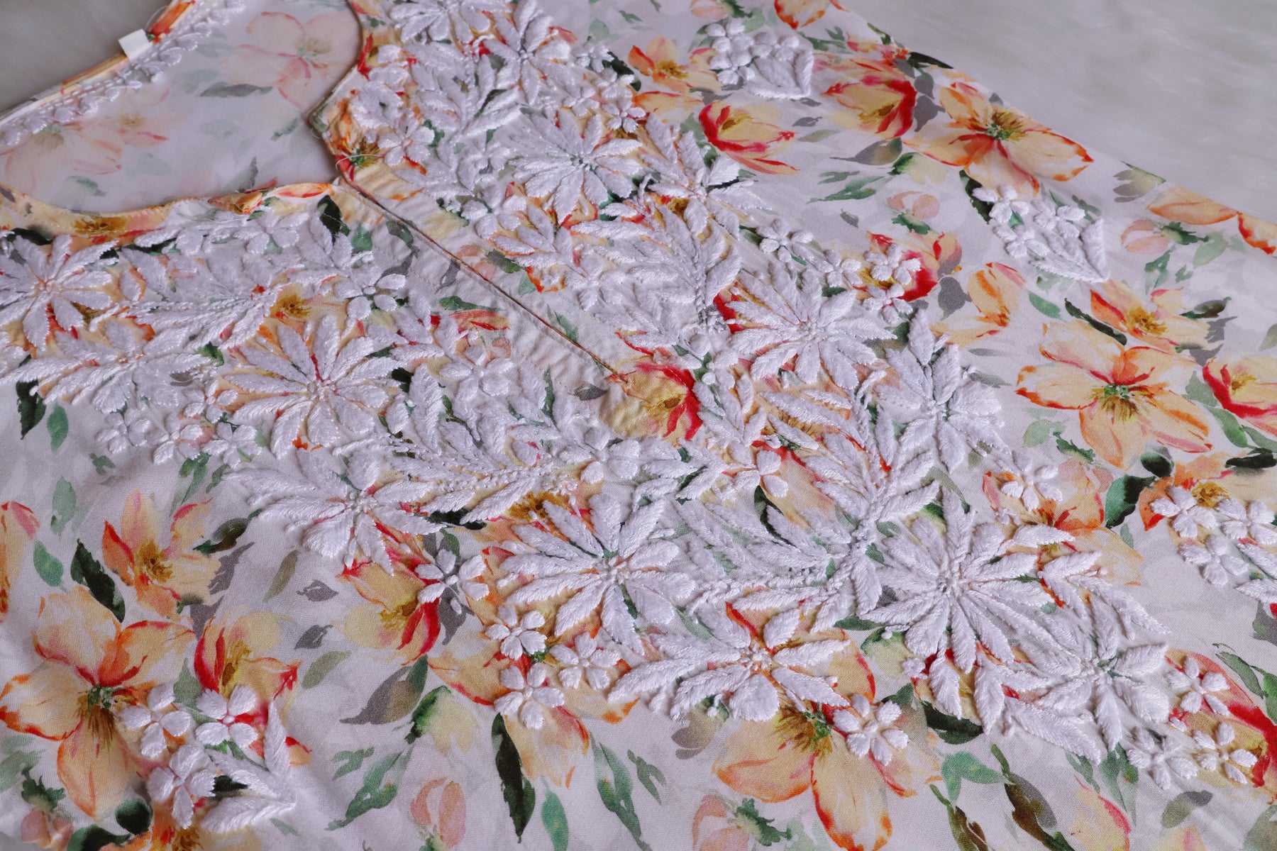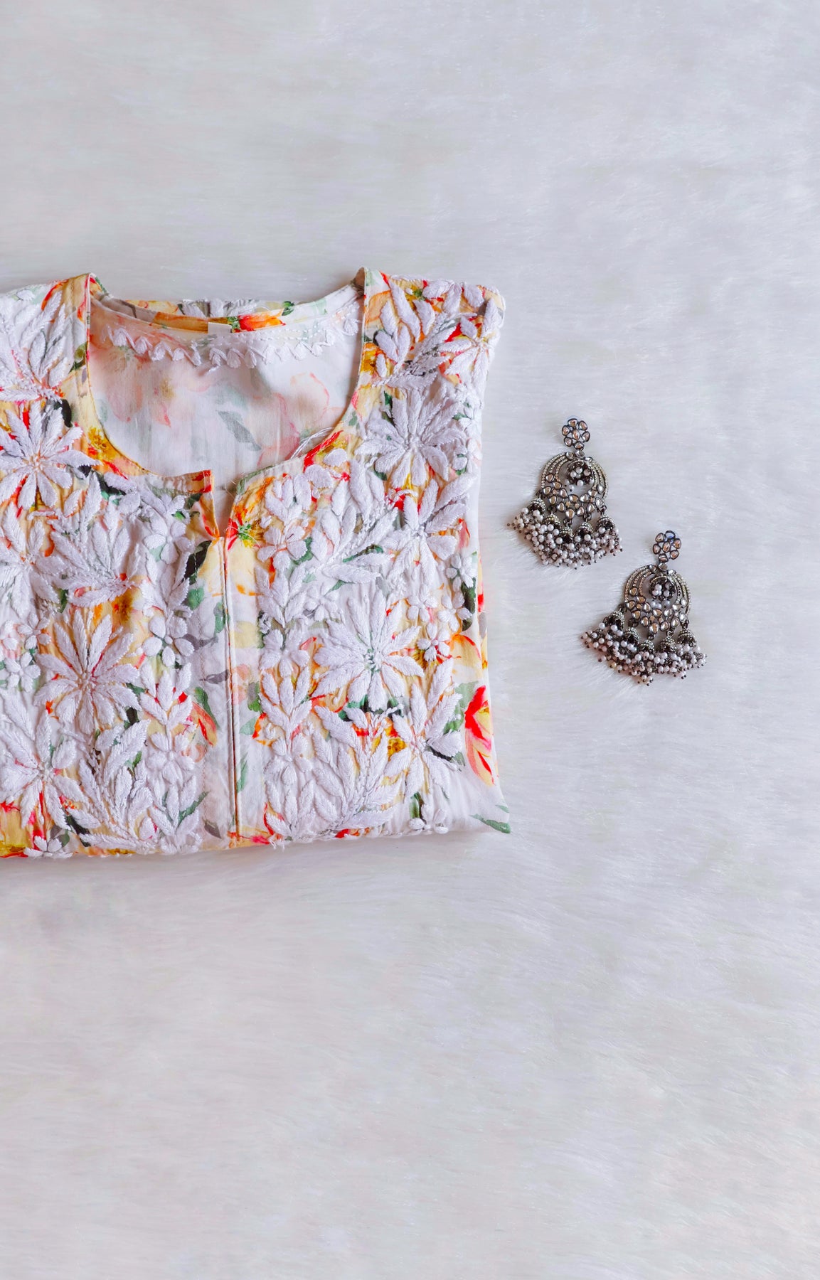 White & Yellow  Long Rayon Kurta in Eyecatching print with chikankari handwork in Paisley pattern with Intricate details. You need a Soft Rayon kurta in all the seasons. They're the most versatile piece of clothing you can own.