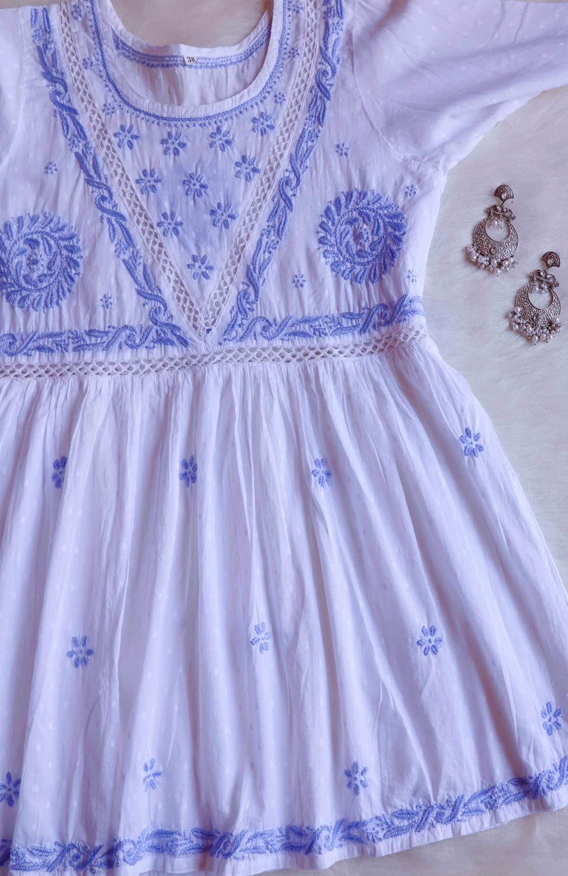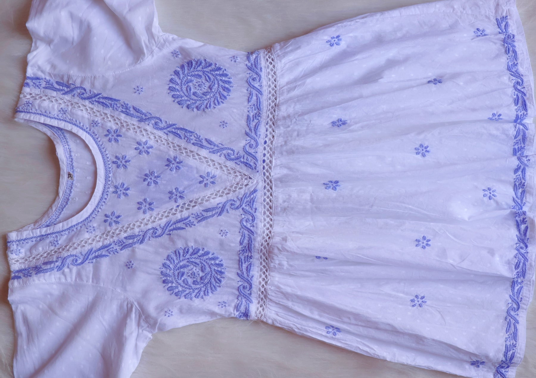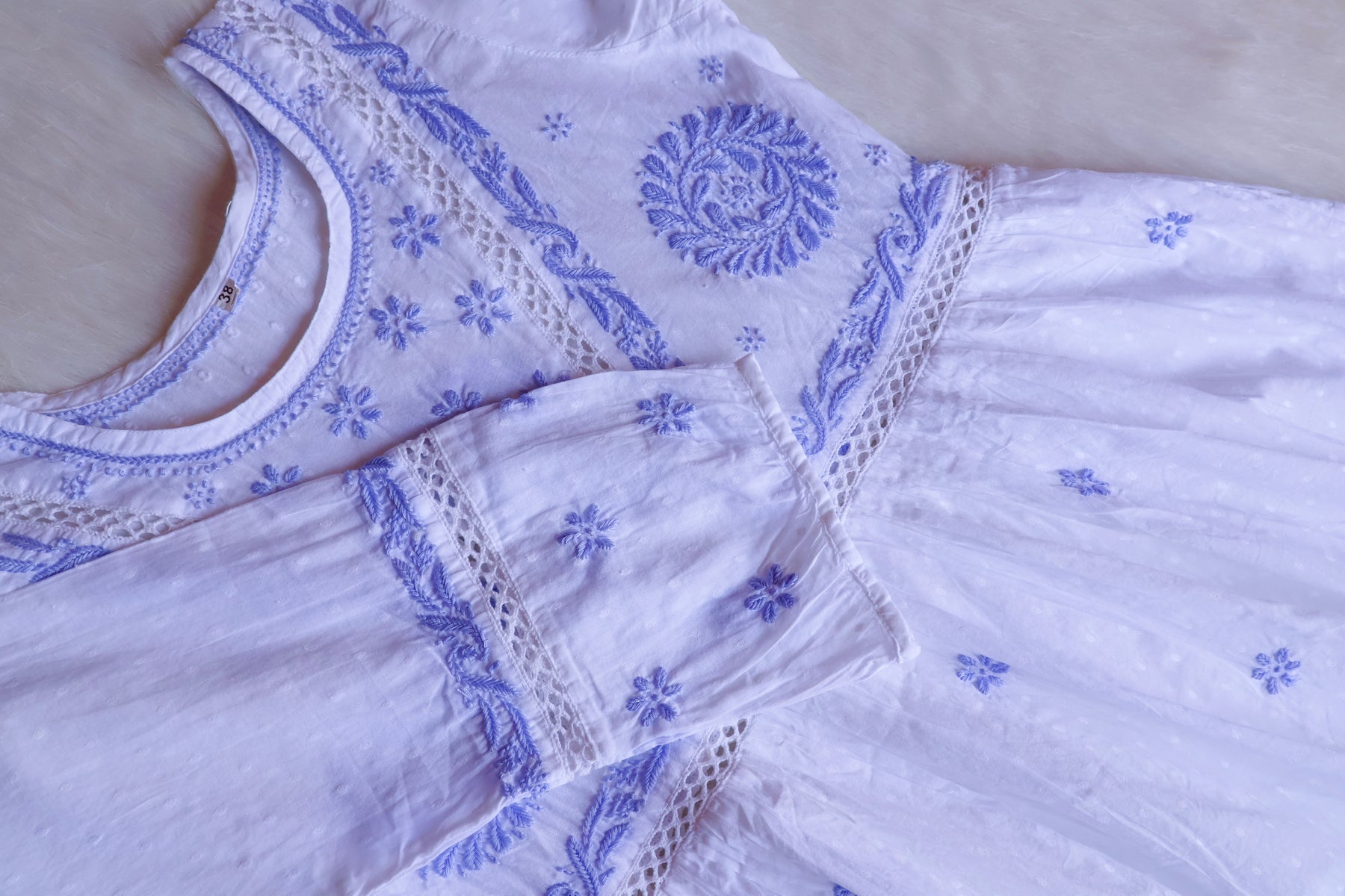 White short cotton top with chikankari handwork in Paisley and Floral pattern.