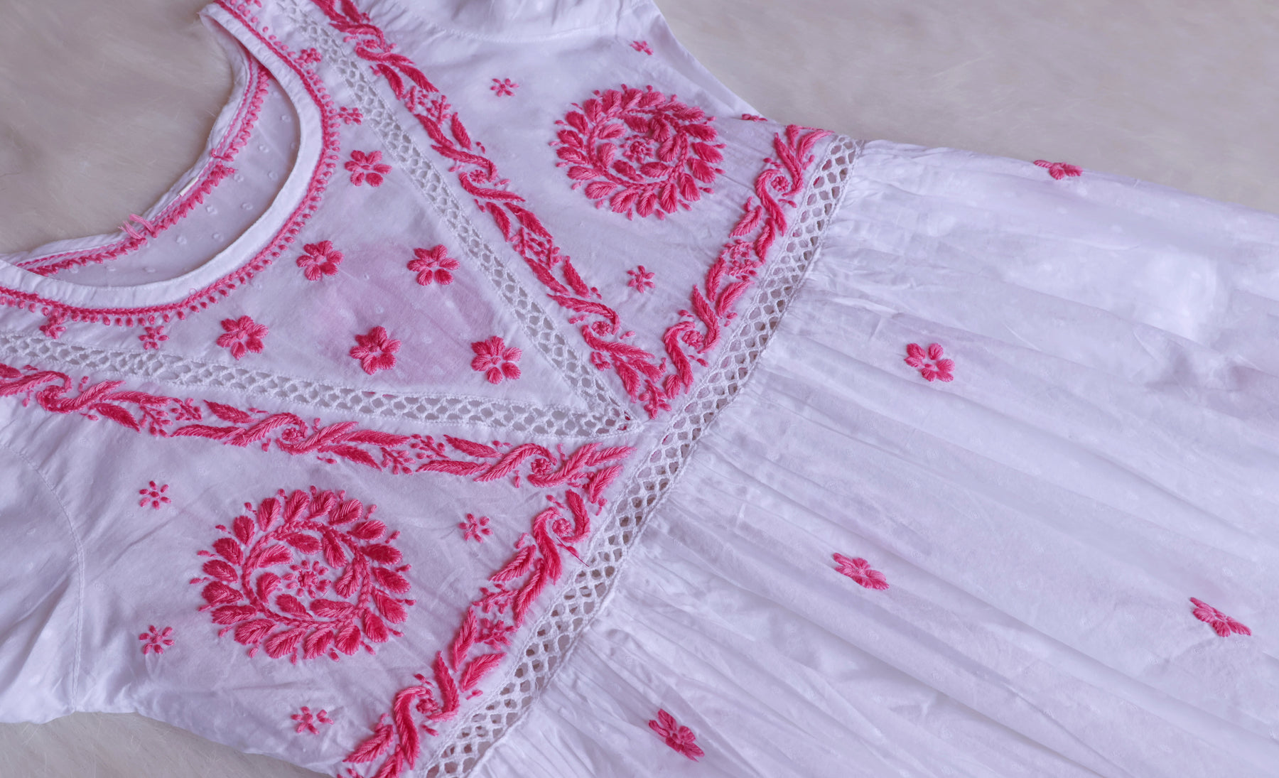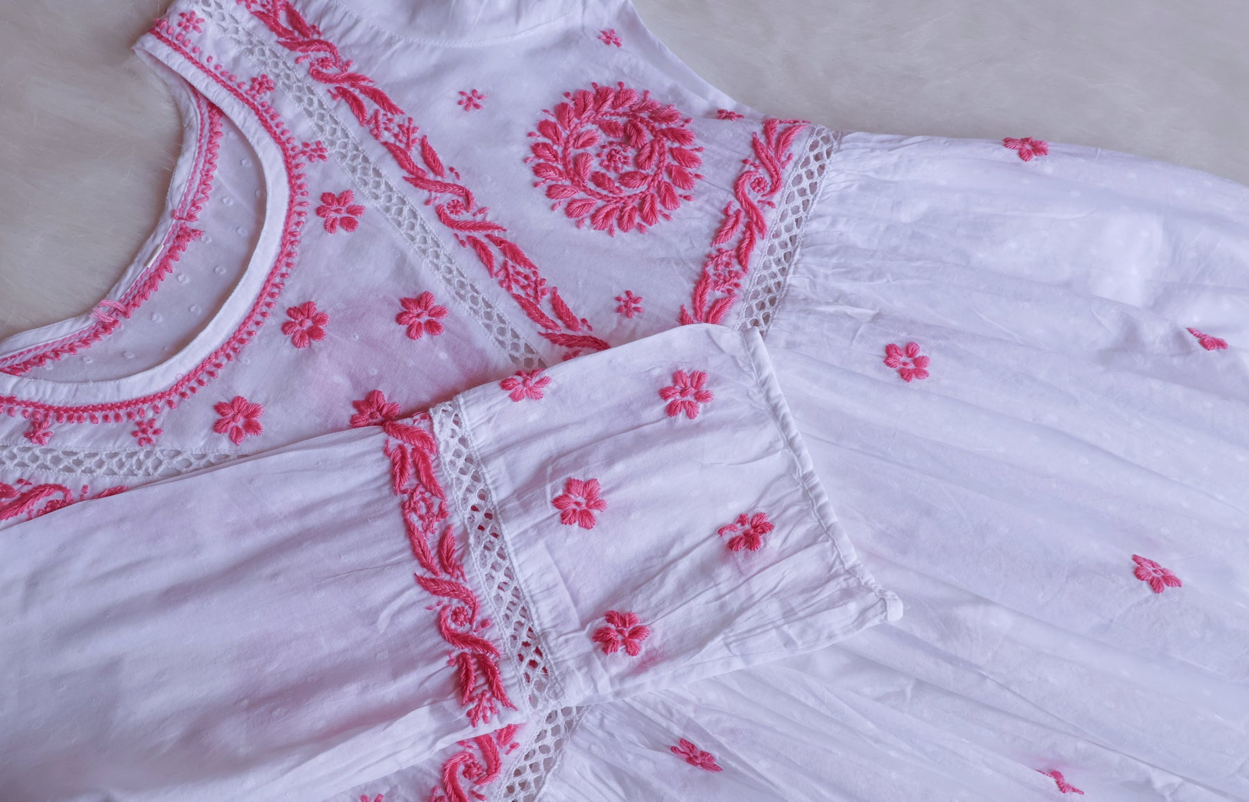 White short cotton top with chikankari handwork in Paisley and Floral pattern.