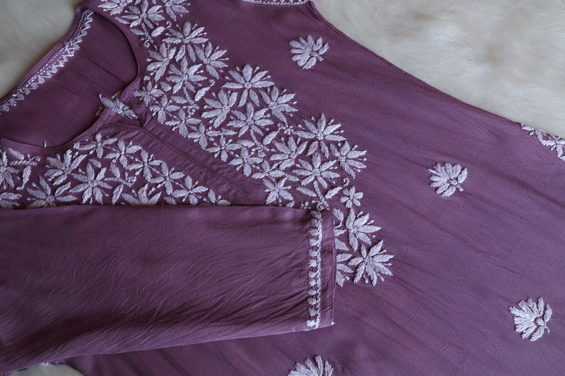 Dusty Purple Rayon long kurta with chikankari handwork in Paisley and Lily Floral pattern in the front to elevate the look.