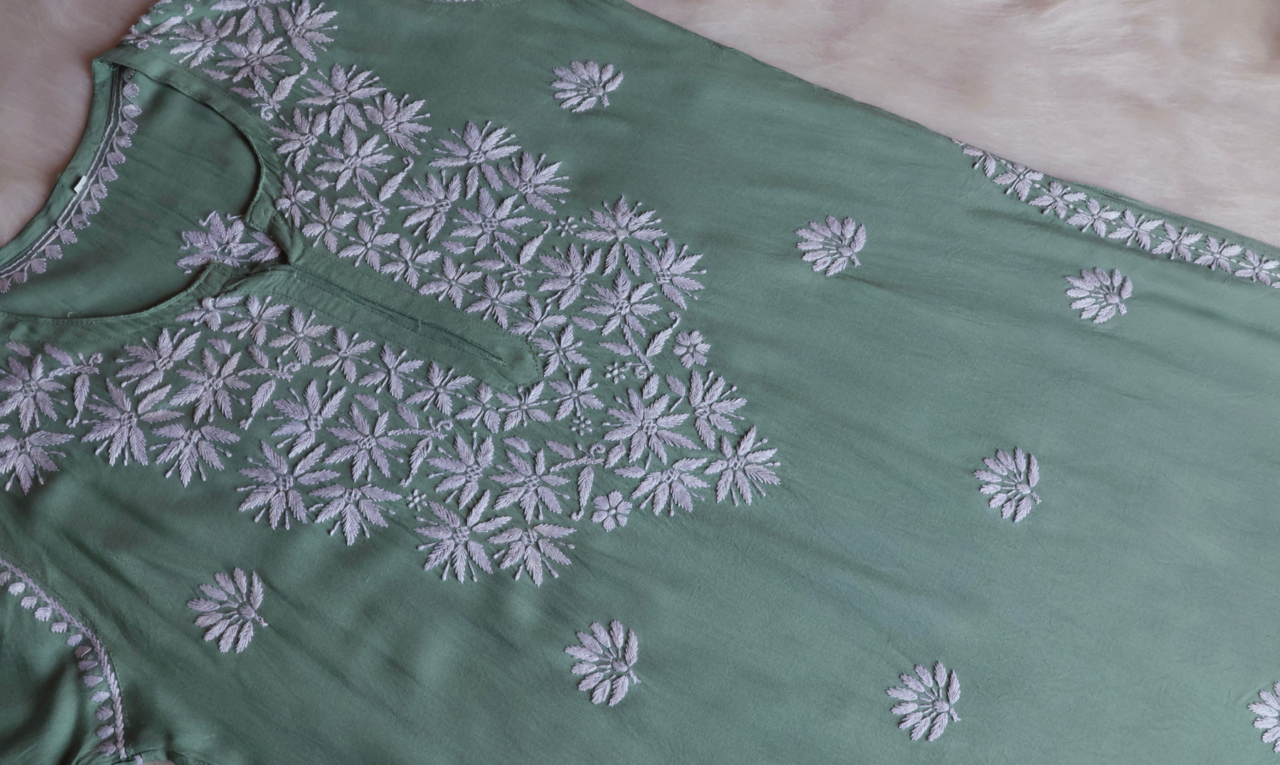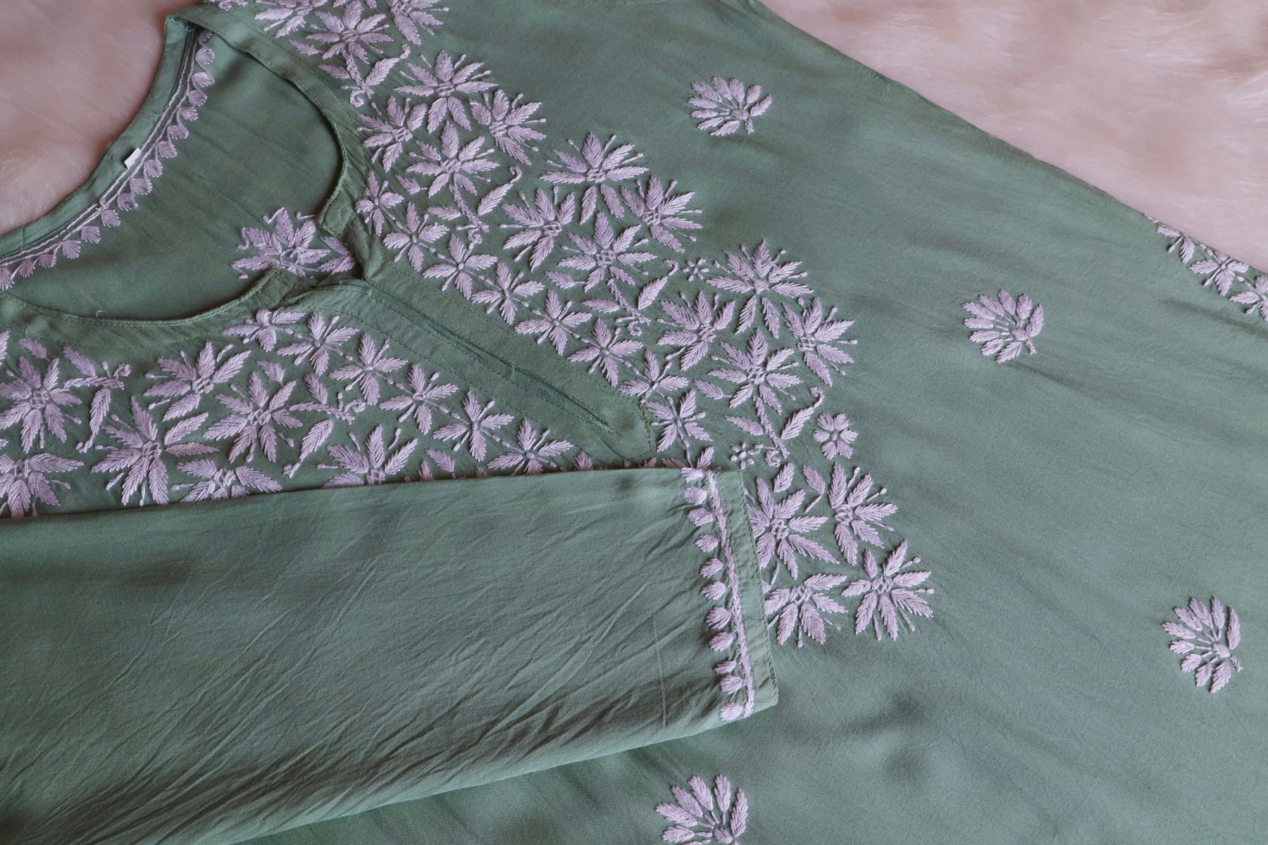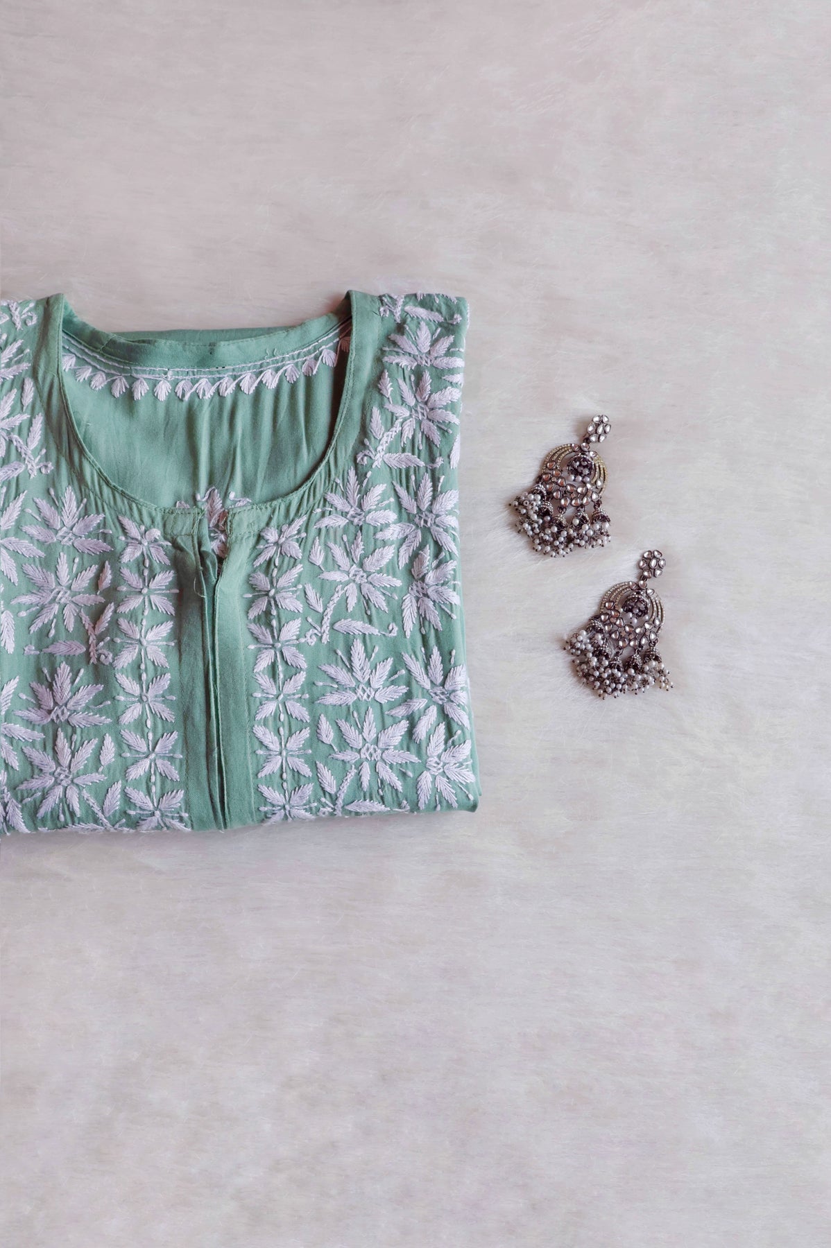 Sage Green Rayon long kurta with chikankari handwork in Paisley and Lily Floral pattern in the front to elevate the look.
