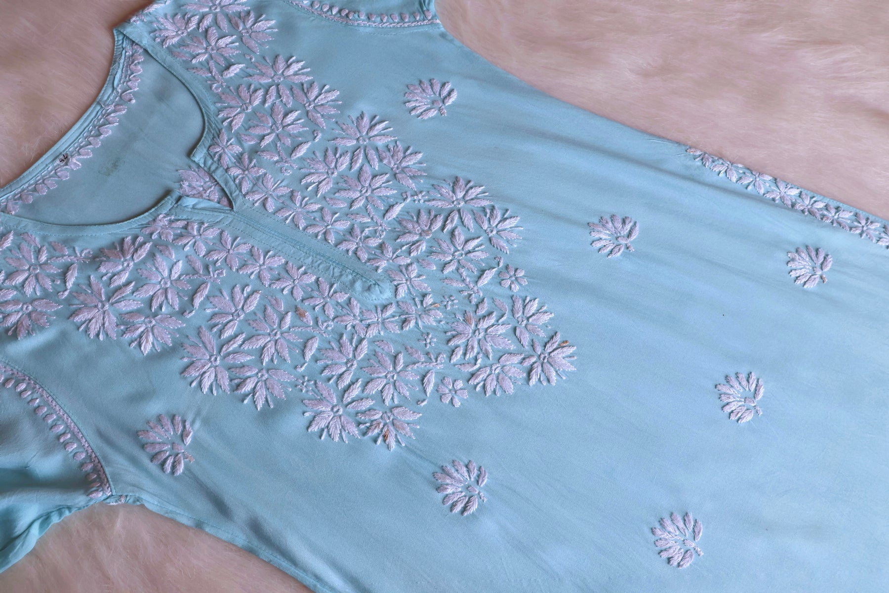 Sky Blue Rayon long kurta with chikankari handwork in Paisley and Lily Floral pattern in the front to elevate the look.