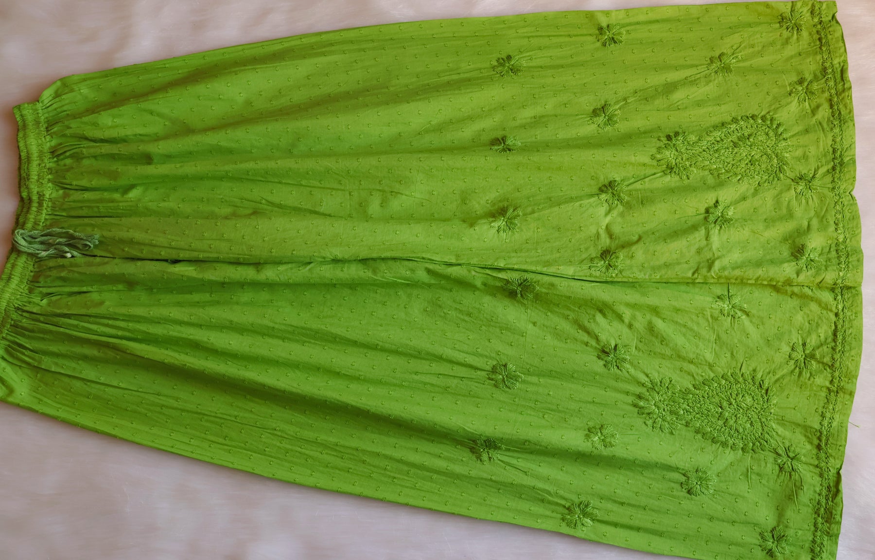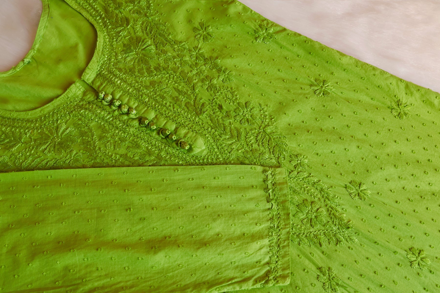 Green Long cotton kurta with Self toned chikankari in Floral pattern and Potli buttons paired with a matching palazzo to complete the look.