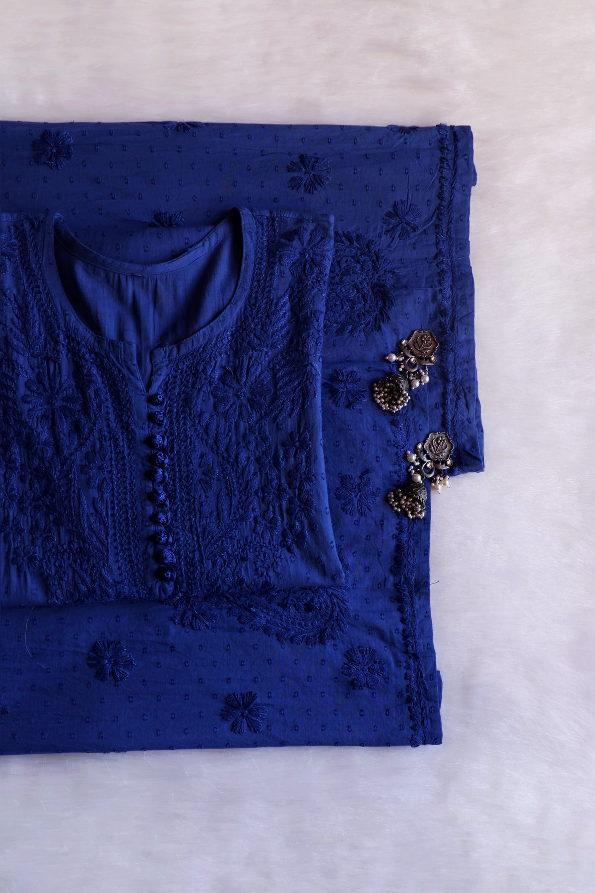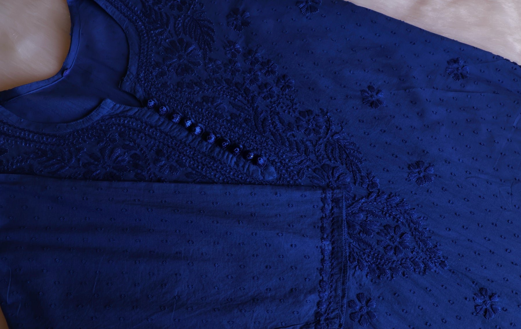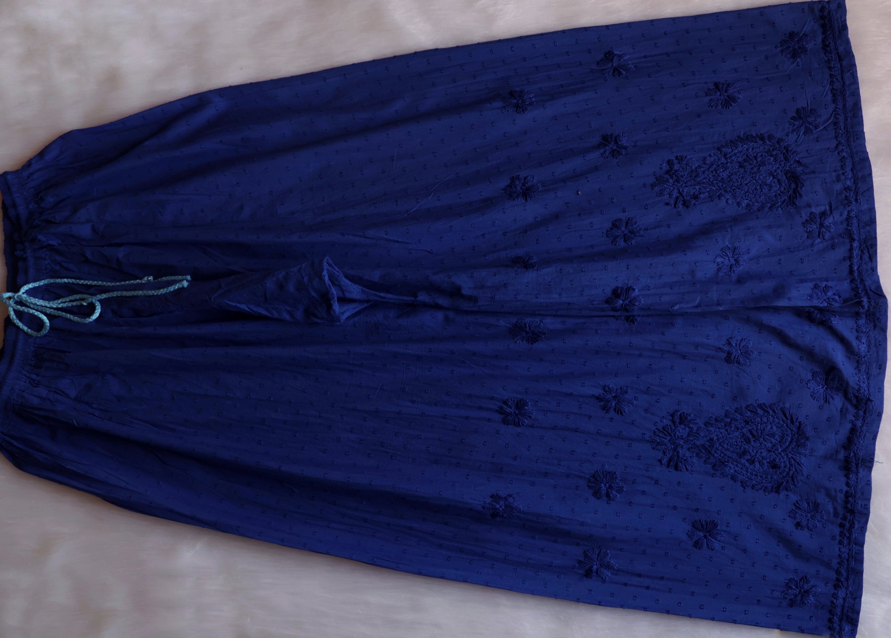 Royal Blue Long cotton kurta with Self toned chikankari in Floral pattern and Potli buttons paired with a matching palazzo to complete the look.