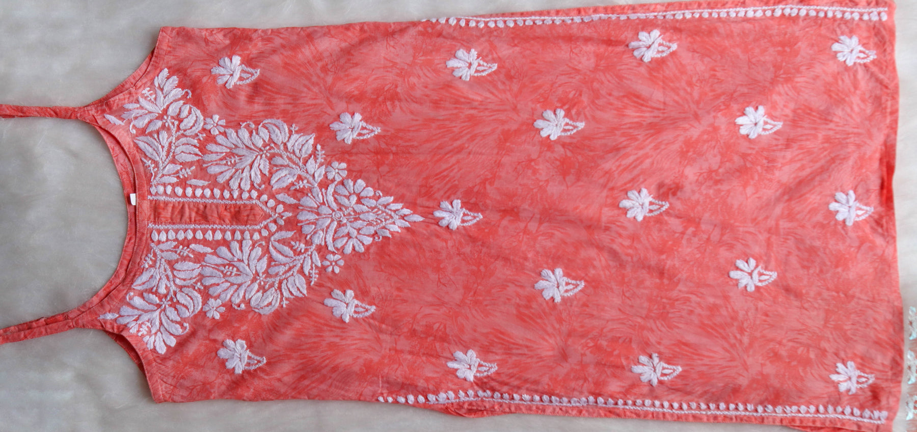 Peach Mulmul kurta with chikankari handwork in Paisley and Floral pattern with Strappy sleeves.