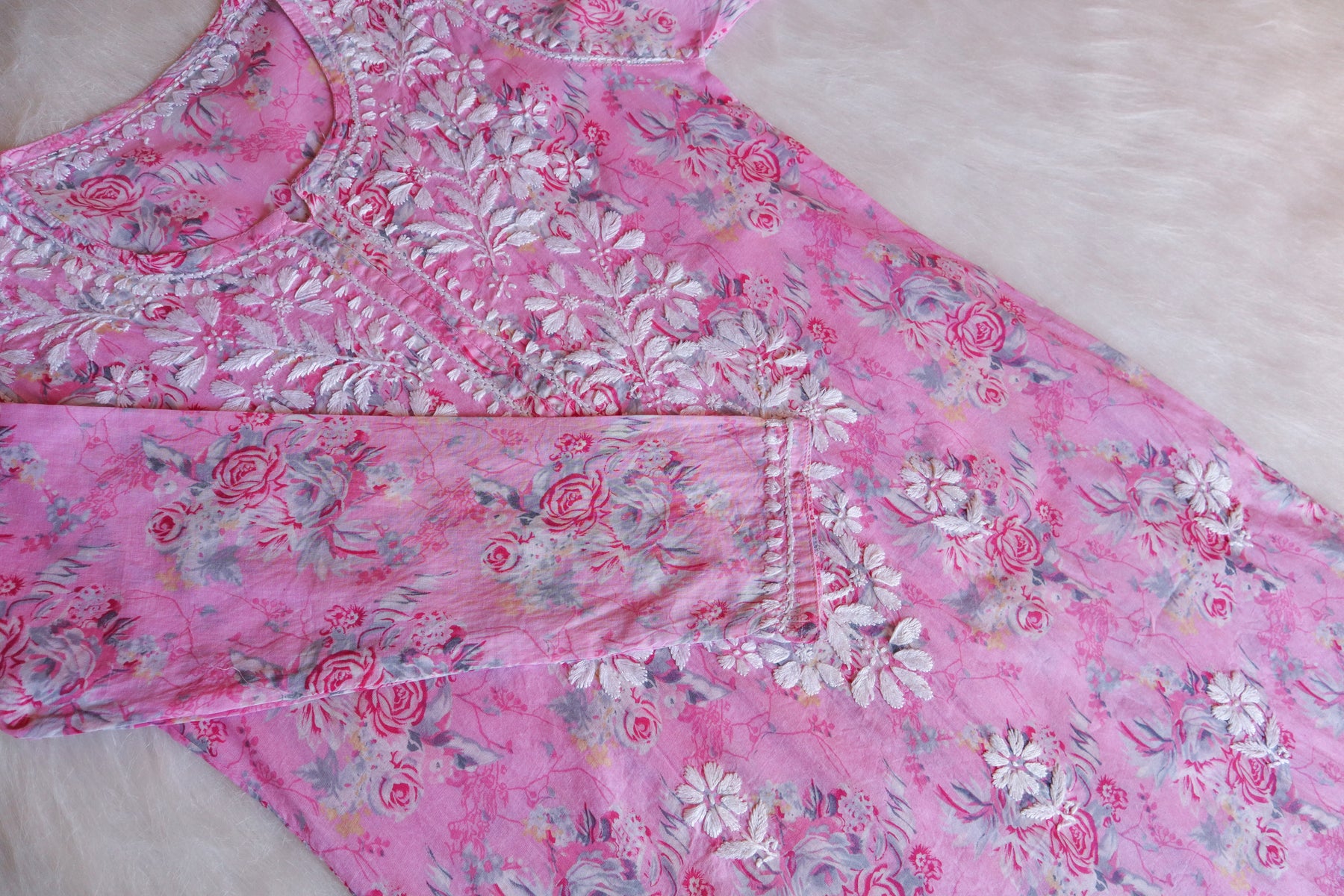 Baby Pink Long Mulmul kurta with White chikankari in Floral & Leaf print all over.