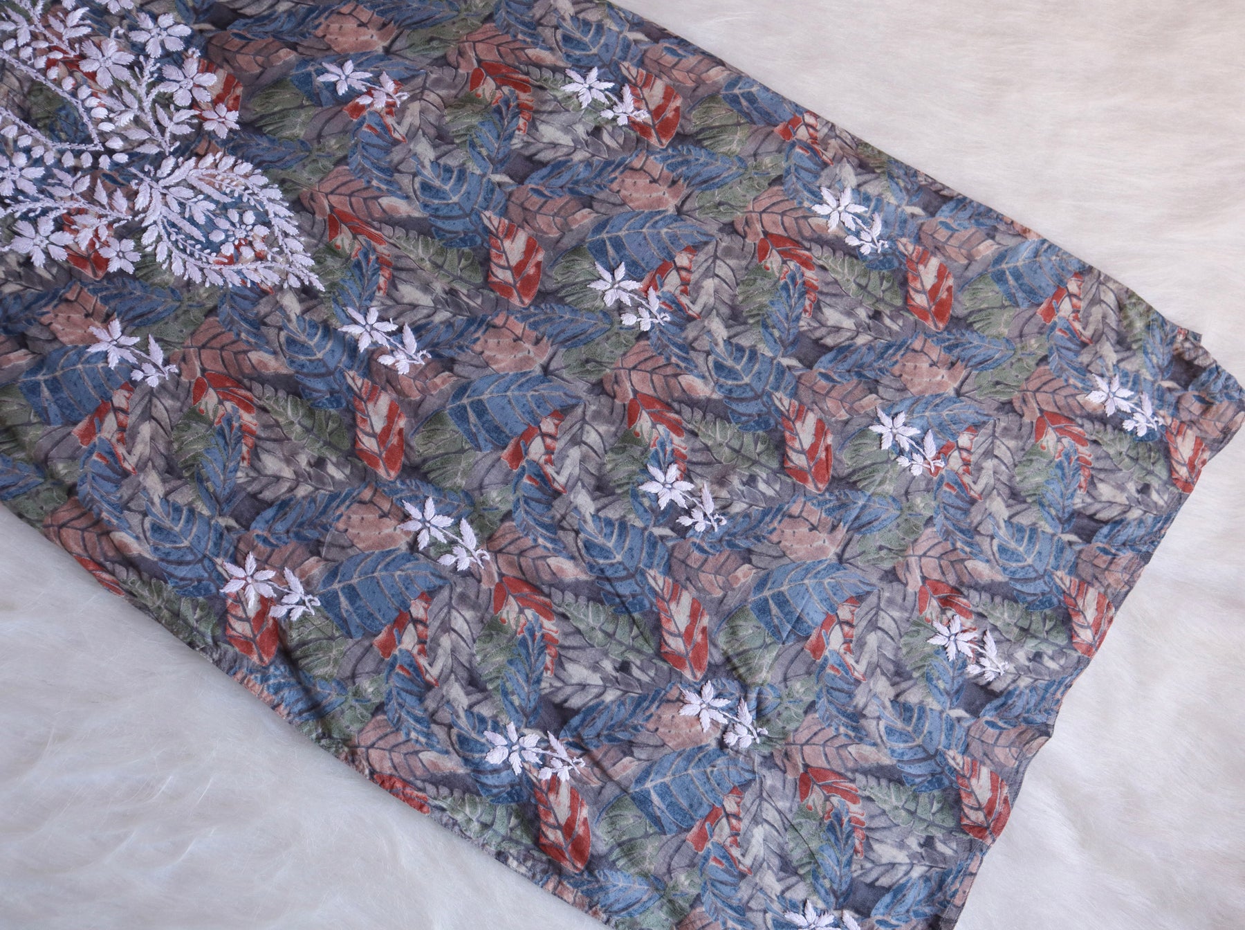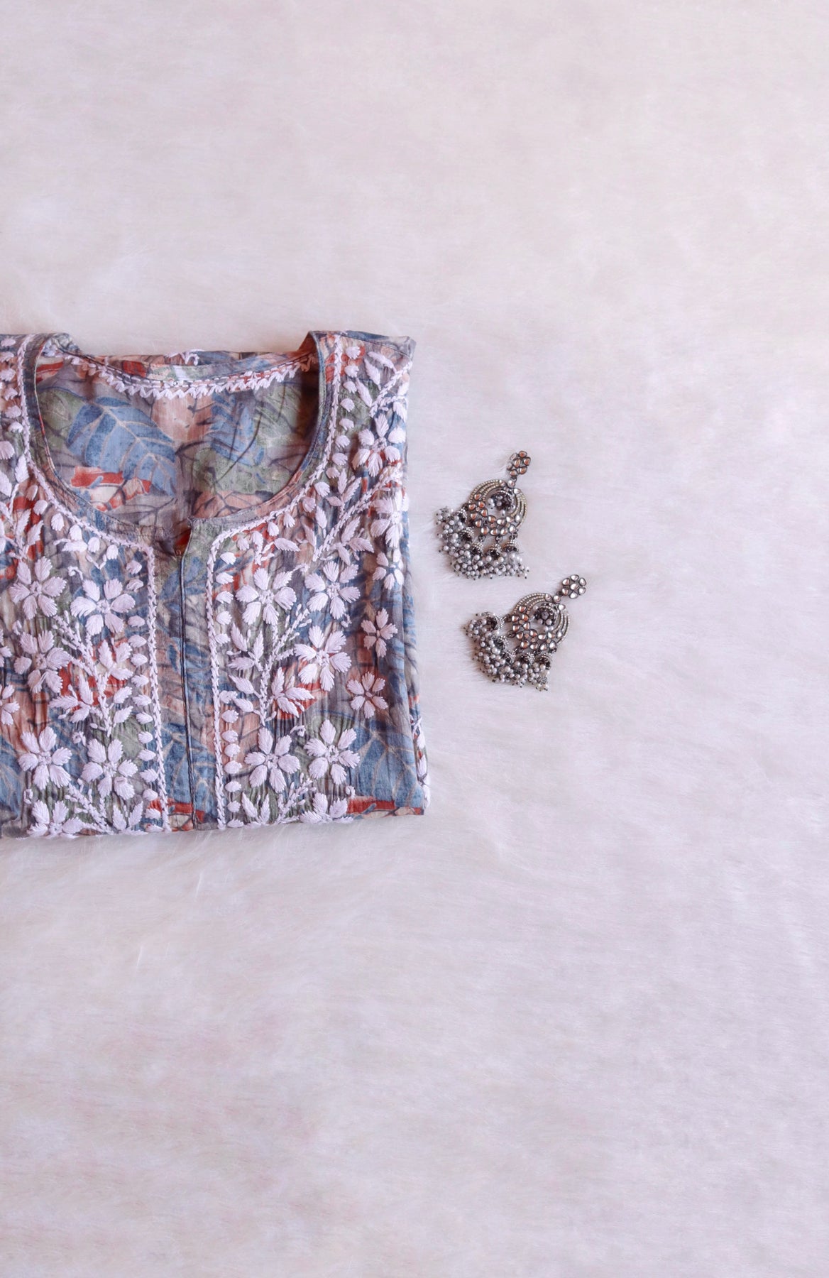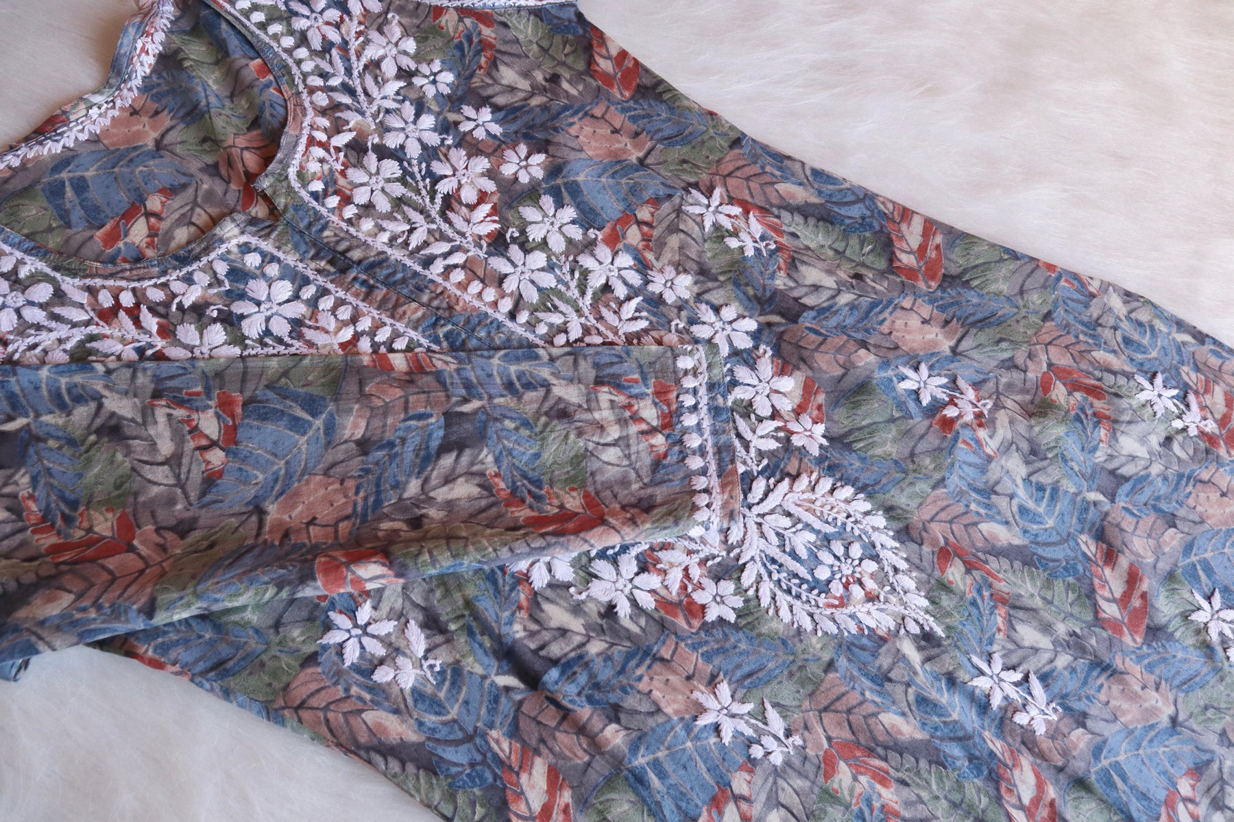Grey Long Mulmul kurta with White chikankari in Floral & Leaf print all over.