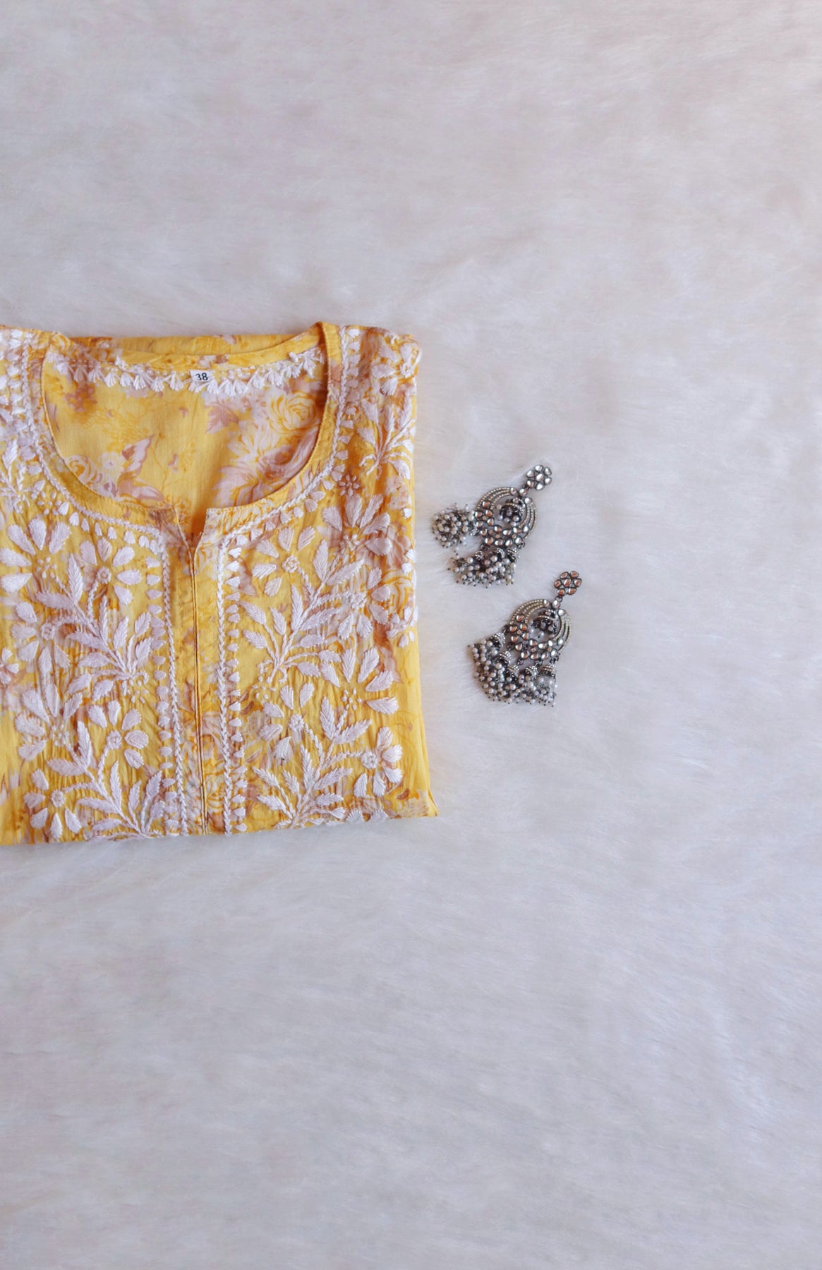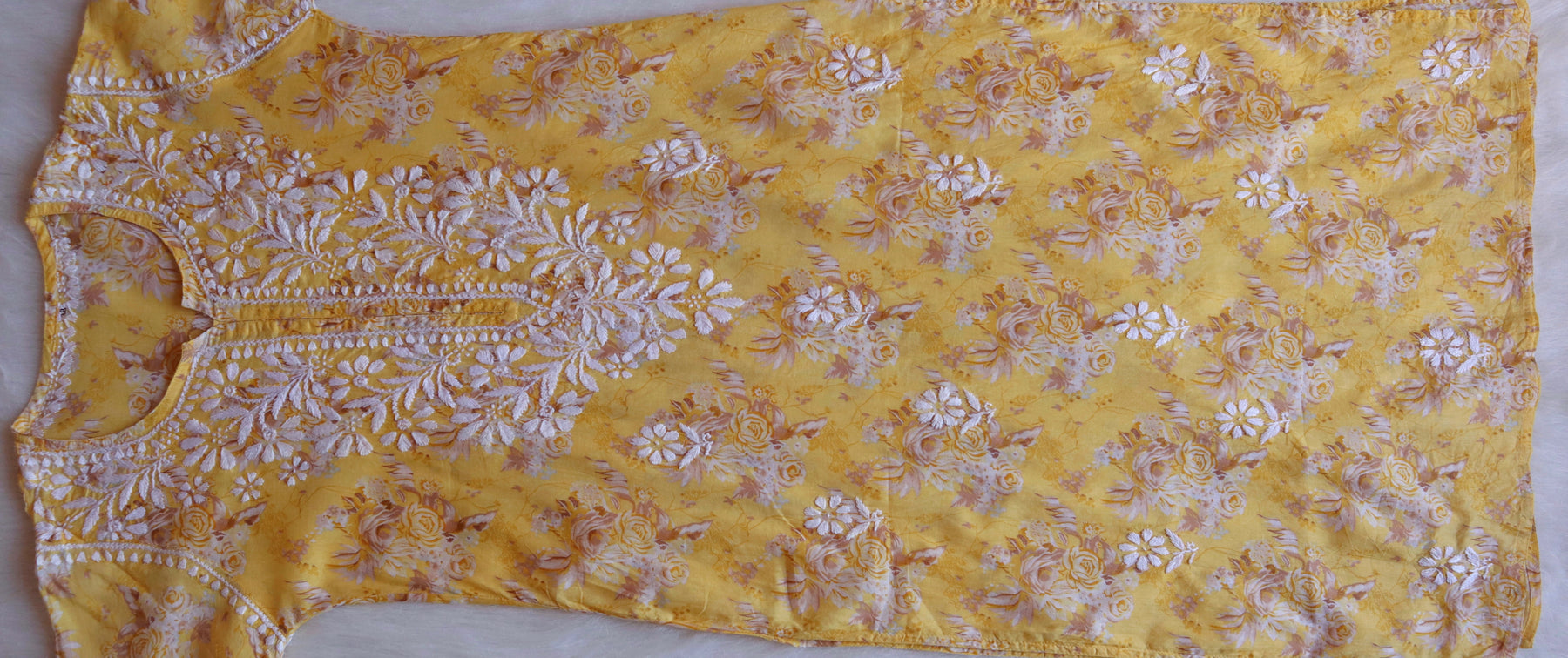 Yellow Long Mulmul kurta with White chikankari in Floral & Leaf print all over.