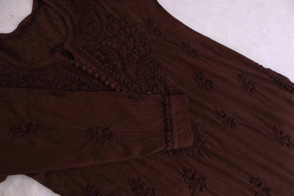 Chocolate brown Mulmul kurta with chikankari handwork in Paisley and Floral pattern with beautiful crotia buttons in the front to elevate the look.