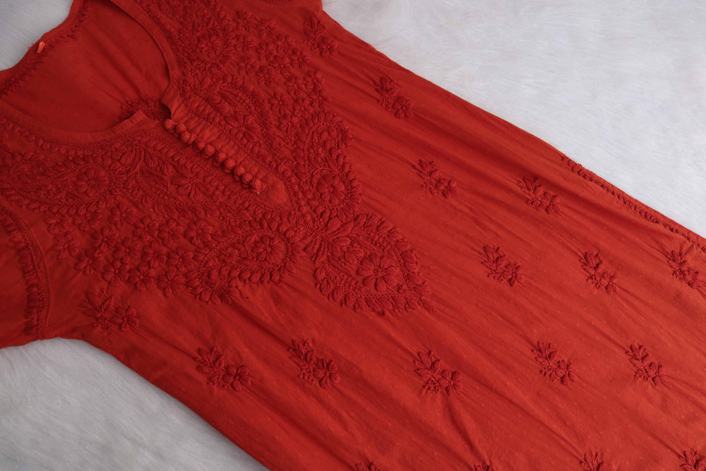 Rust cotton kurta with chikankari handwork in Paisley and Floral pattern with beautiful crotia buttons in the front to elevate the look. It's a really Stunning kurta from our Nazakat premium collection with beautiful details! It's perfect and is made for everyone.