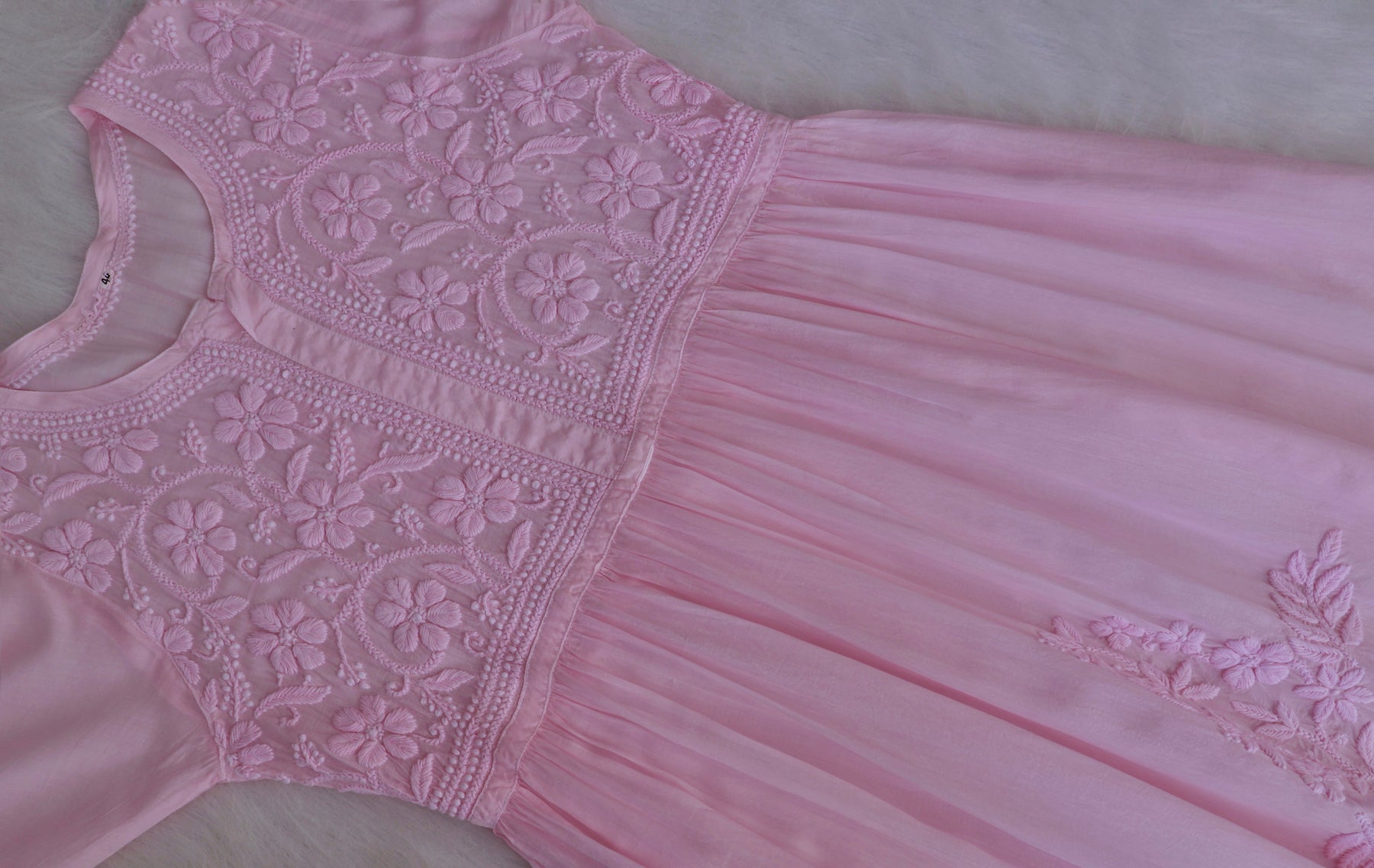 Baby Pink Long pure Muslin Fit and flare dress with Premium placement chikankari in Floral & Paisley to accentuate the look even more.