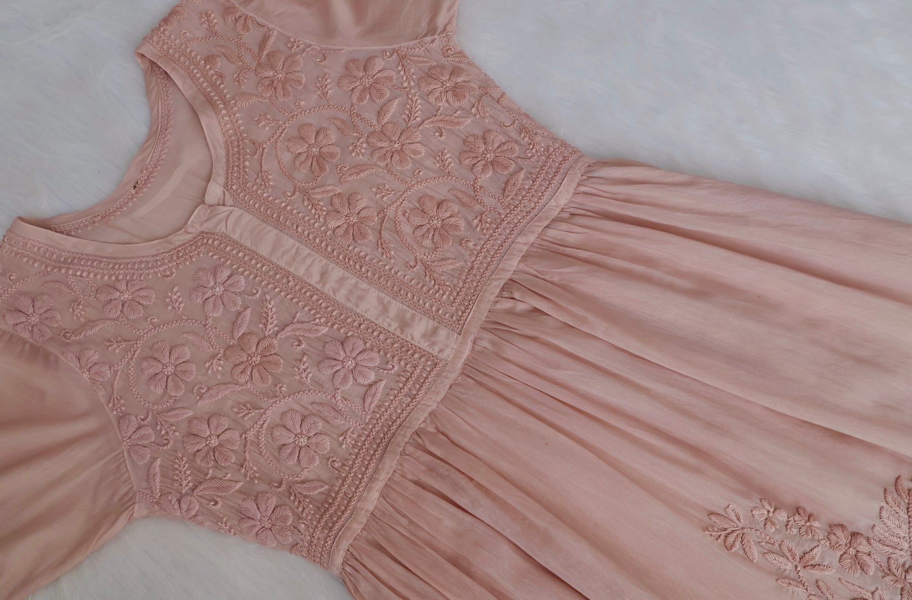 Beige Long pure Muslin Fit and flare dress with Premium placement chikankari in Floral & Paisley to accentuate the look even more.