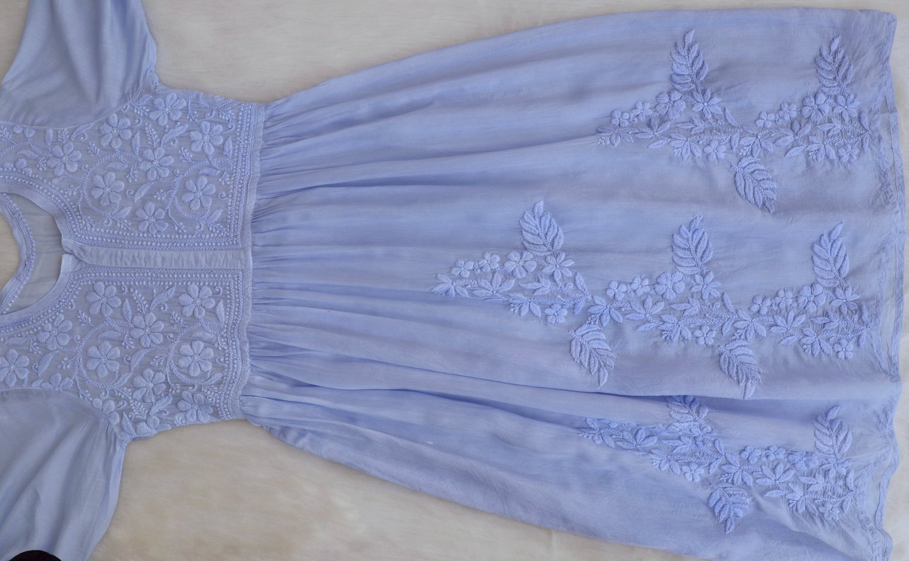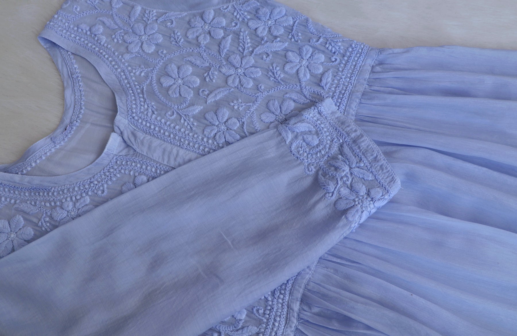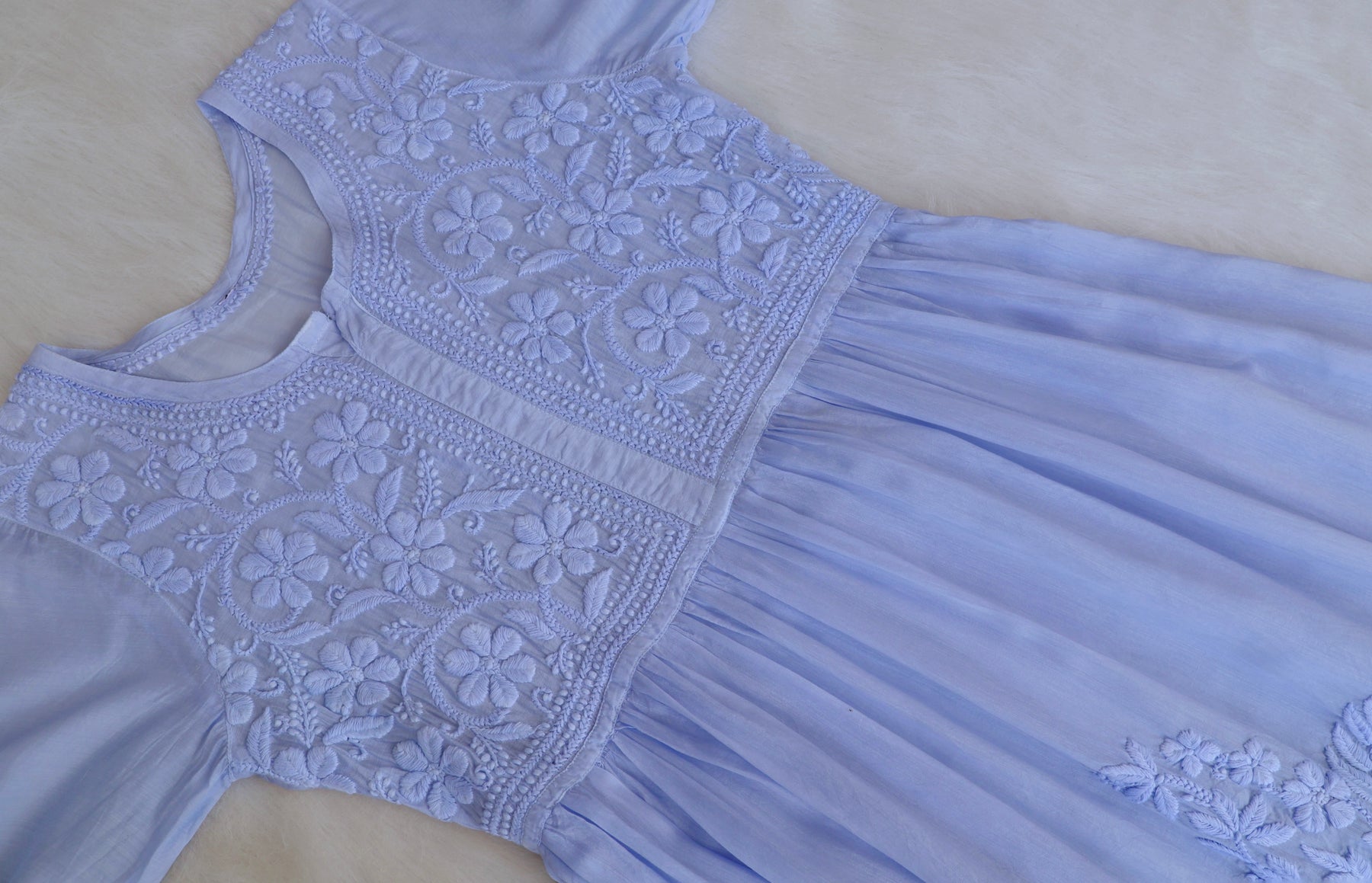Ice Blue Long pure Muslin Fit and flare dress with Premium placement chikankari in Floral & Paisley to accentuate the look even more.