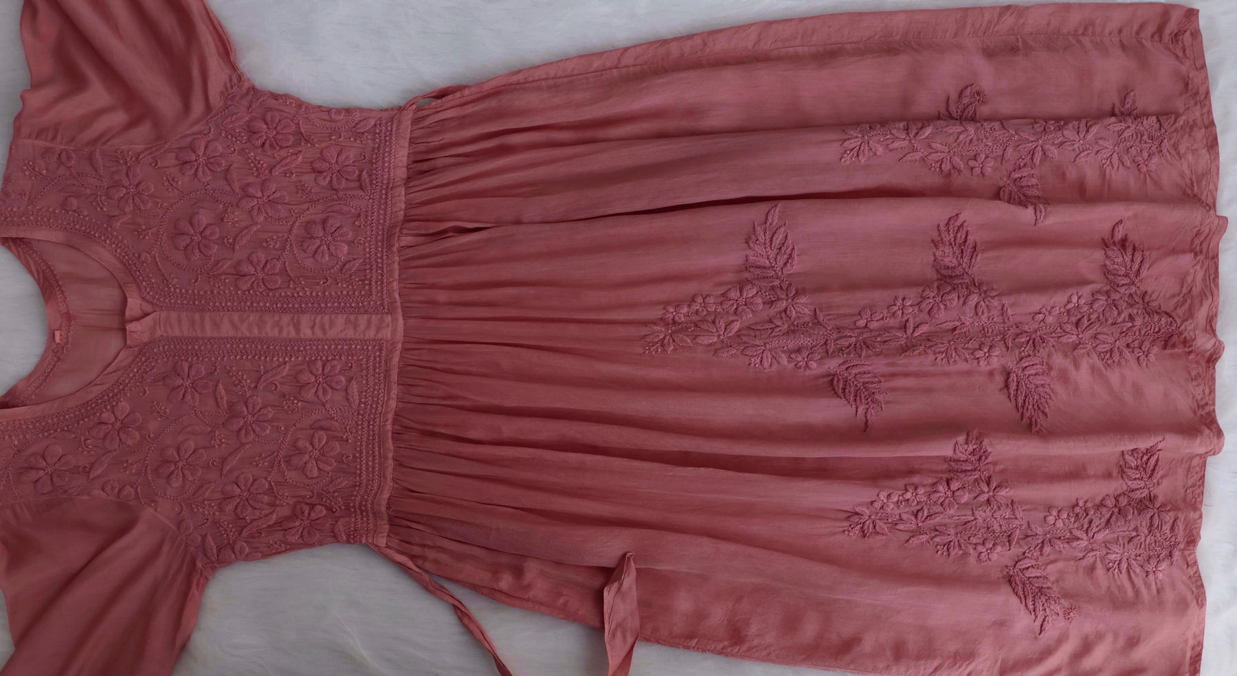 Rose Brown Long pure Muslin Fit and flare dress with Premium placement chikankari in Floral & Paisley to accentuate the look even more.