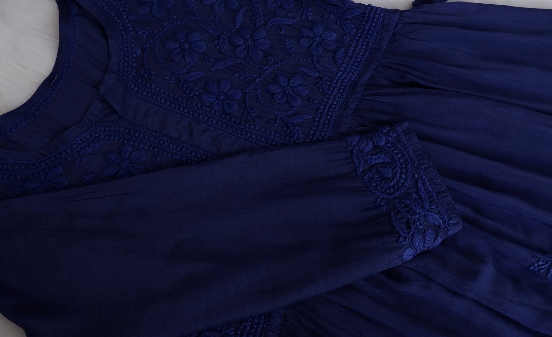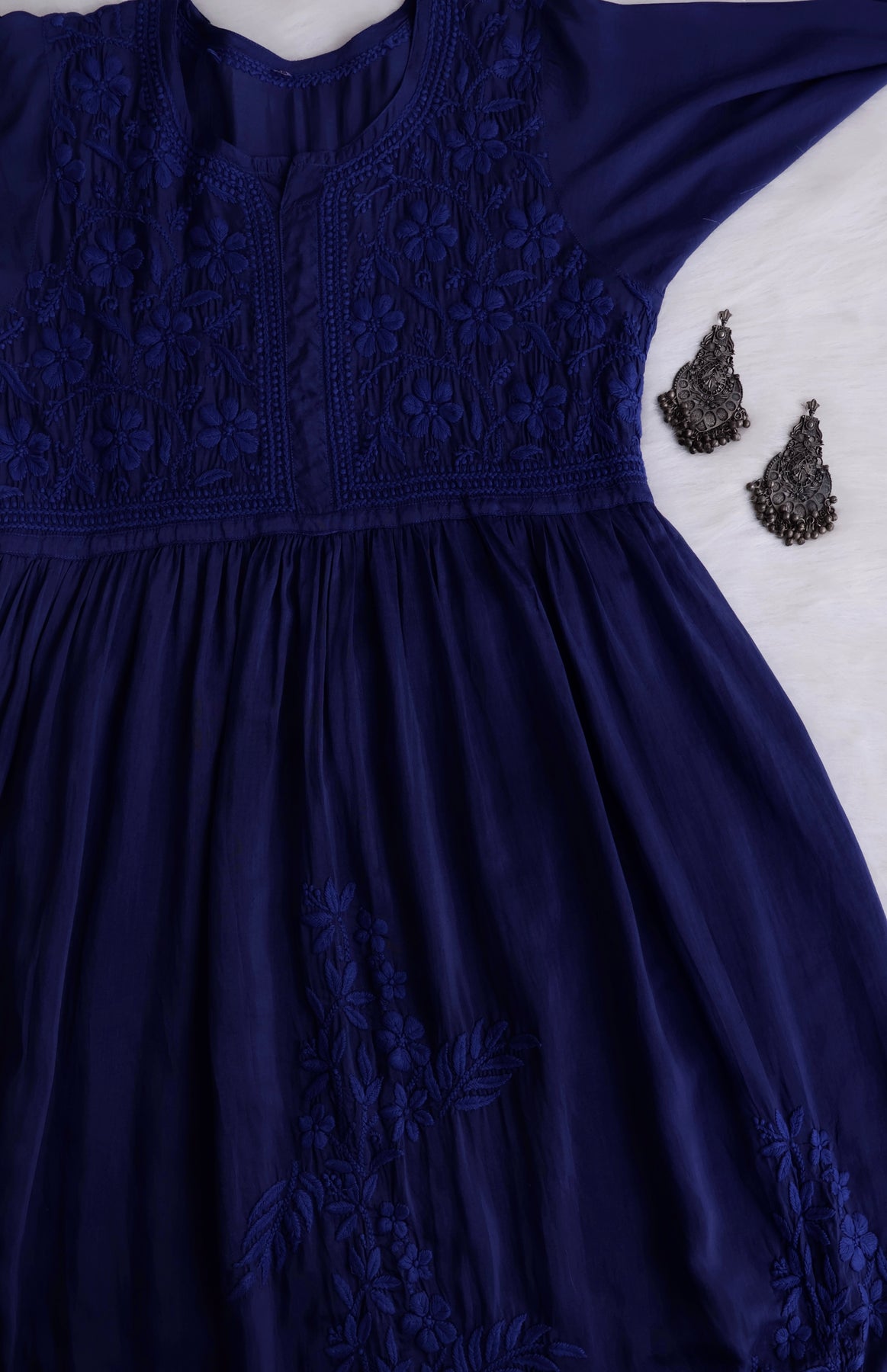 Royal Blue Long pure Muslin Fit and flare dress with Premium placement chikankari in Floral & Paisley to accentuate the look even more.